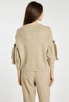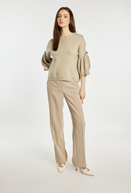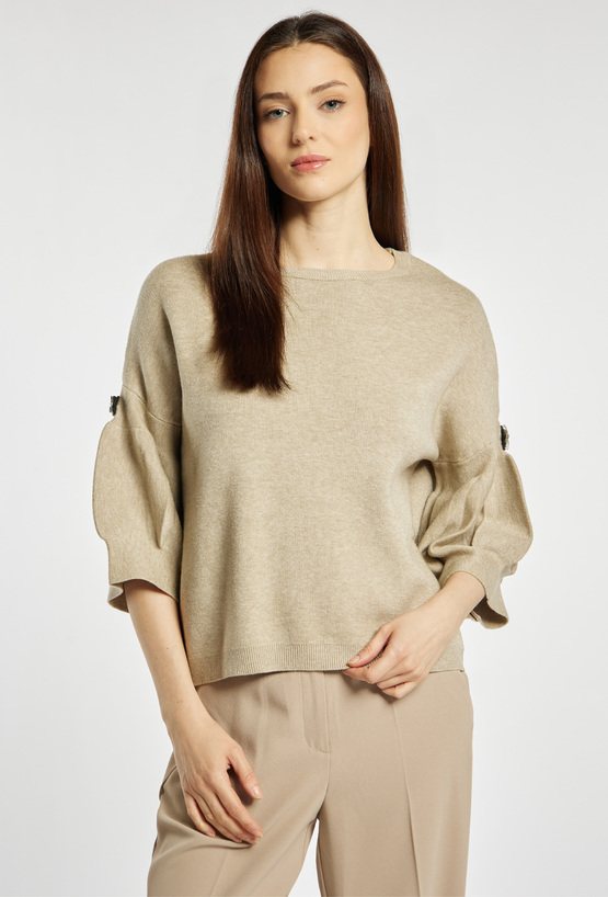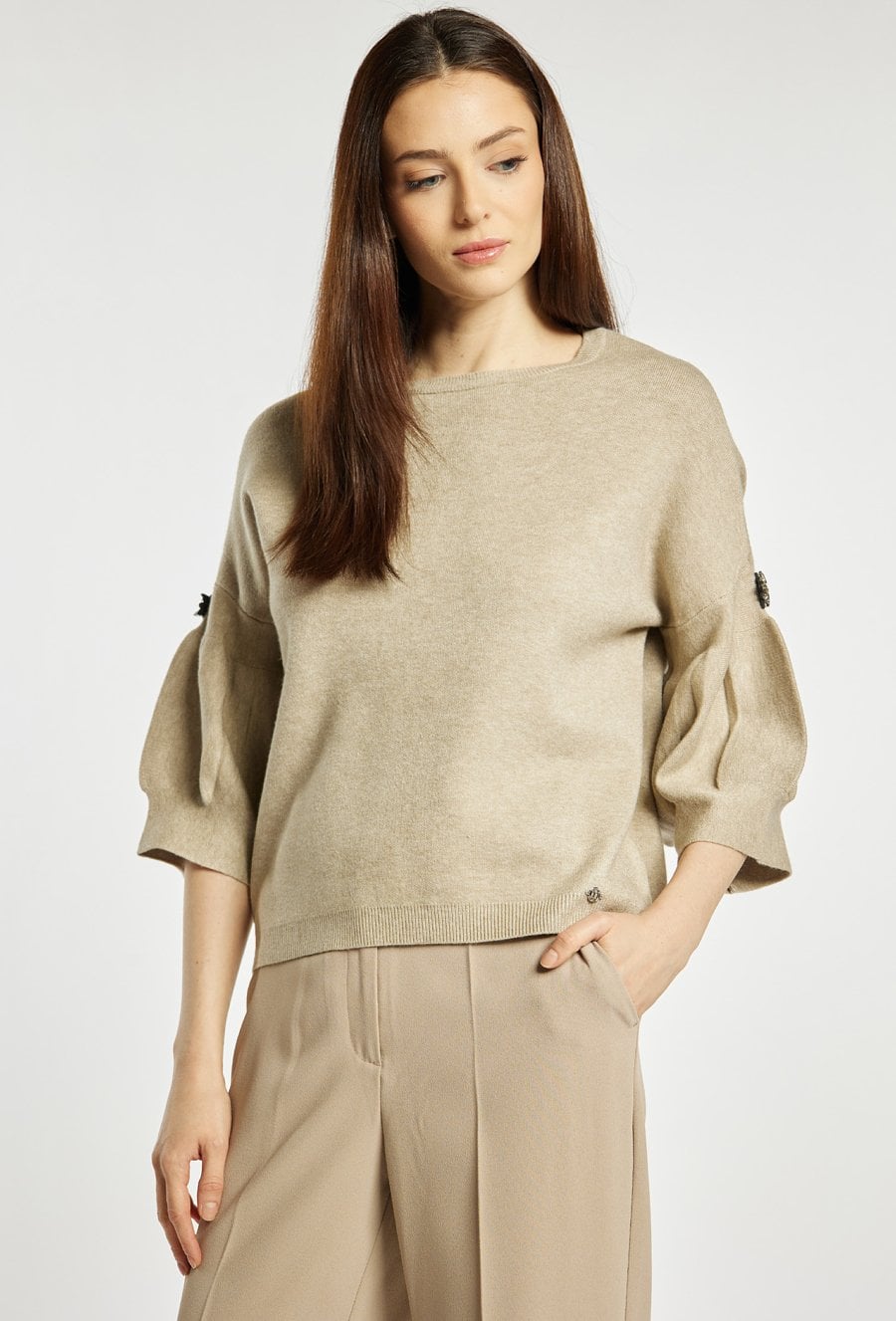 Sweter damski o nowoczesnym, luźnym kroju. Model z półokrągłym dekoltem oraz efektownymi rękawami o rozszerzanym fasonie, które nadają stylizacji oryginalnego charakteru. Gładka dzianina zapewnia komfort noszenia, a subtelna aplikacja przy rękawie stanowi elegancki detal wykończeniowy. Modelka na zdjęciu ma 177 cm wzrostu i prezentuje rozmiar S/M.