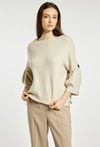 Sweter damski o nowoczesnym, luźnym kroju. Model z półokrągłym dekoltem oraz efektownymi rękawami o rozszerzanym fasonie, które nadają stylizacji oryginalnego charakteru. Gładka dzianina zapewnia komfort noszenia, a subtelna aplikacja przy rękawie stanowi elegancki detal wykończeniowy. Modelka na zdjęciu ma 177 cm wzrostu i prezentuje rozmiar S/M.