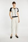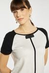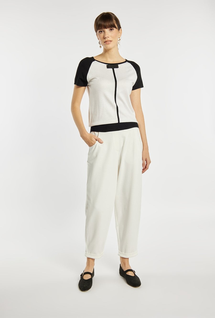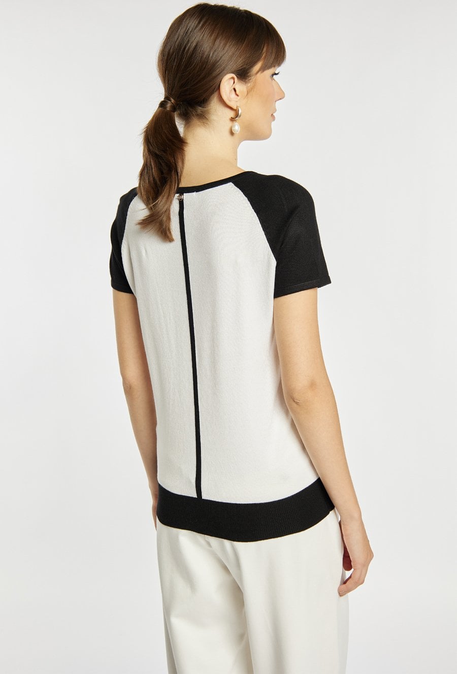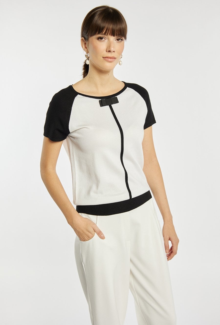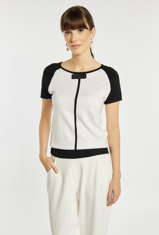 Sweter o krótkim rękawie w eleganckim, kontrastowym połączeniu kolorystycznym. Sweter zachwyca prostą linią, dekoracyjną lamówką na przodzie i niewielką ozdobną kokardką przy dekolcie, co nadaje mu subtelnie szykowny charakter. Modelka na zdjęciu ma 177 cm wzrostu i prezentuje rozmiar S.
