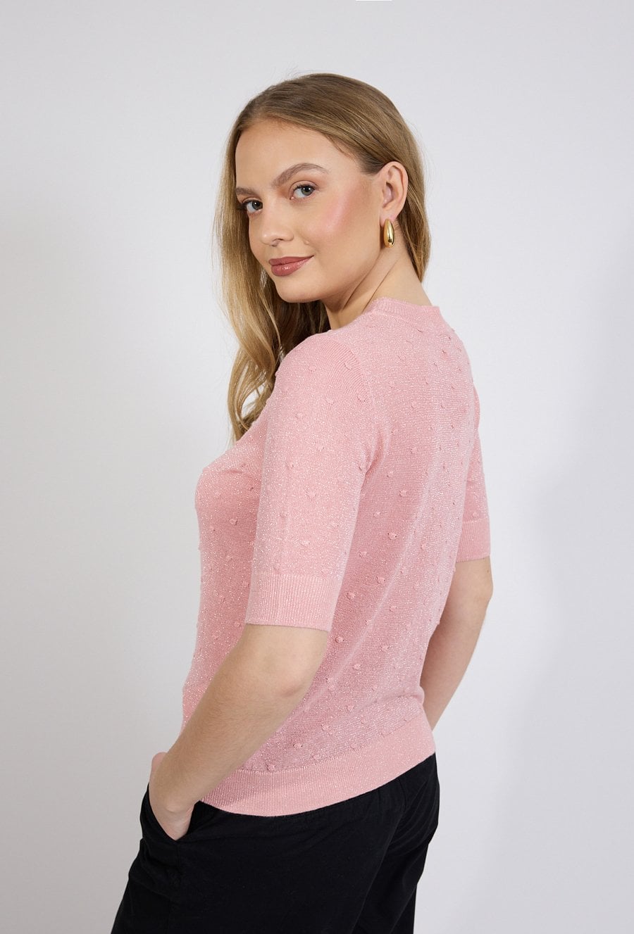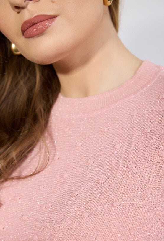 Sweter damski o klasycznym, kobiecym kroju. Model z krótkim rękawem oraz zaokrąglonym dekoltem, który zapewnia wygodę noszenia i ponadczasowy wygląd. Damski sweter doskonale sprawdzi się zarówno w codziennych, jak i bardziej eleganckich stylizacjach. W połączeniu ze spodniami materiałowymi, jeansami lub spódnicą stworzy stylowy i komfortowy zestaw na wiele okazji. Modelka na zdjęciu ma 177 cm wzrostu i prezentuje rozmiar S.