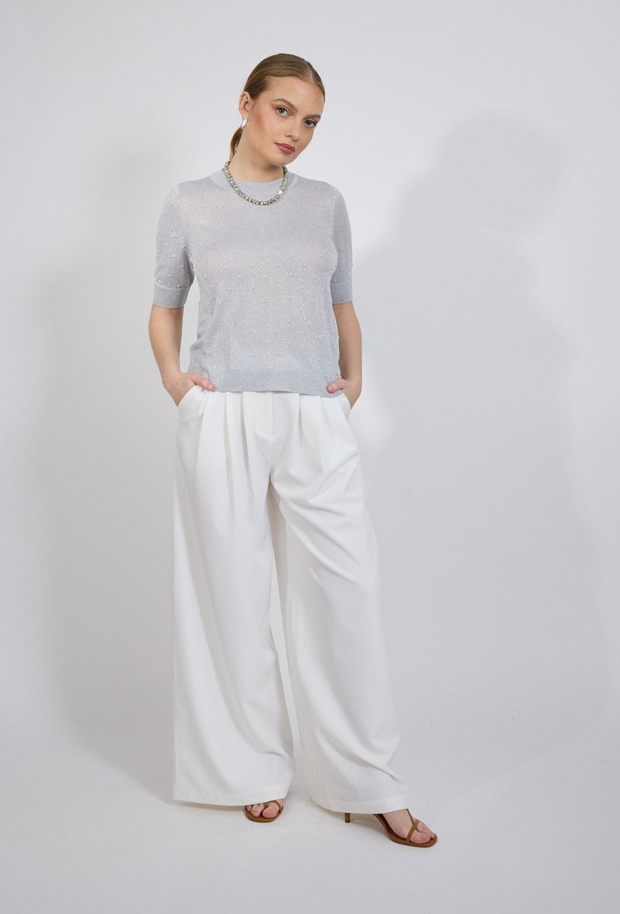 Sweter damski o klasycznym, kobiecym kroju. Model z krótkim rękawem oraz zaokrąglonym dekoltem, który zapewnia wygodę noszenia i ponadczasowy wygląd. Damski sweter doskonale sprawdzi się zarówno w codziennych, jak i bardziej eleganckich stylizacjach. W połączeniu ze spodniami materiałowymi, jeansami lub spódnicą stworzy stylowy i komfortowy zestaw na wiele okazji. Modelka na zdjęciu ma 177 cm wzrostu i prezentuje rozmiar S.