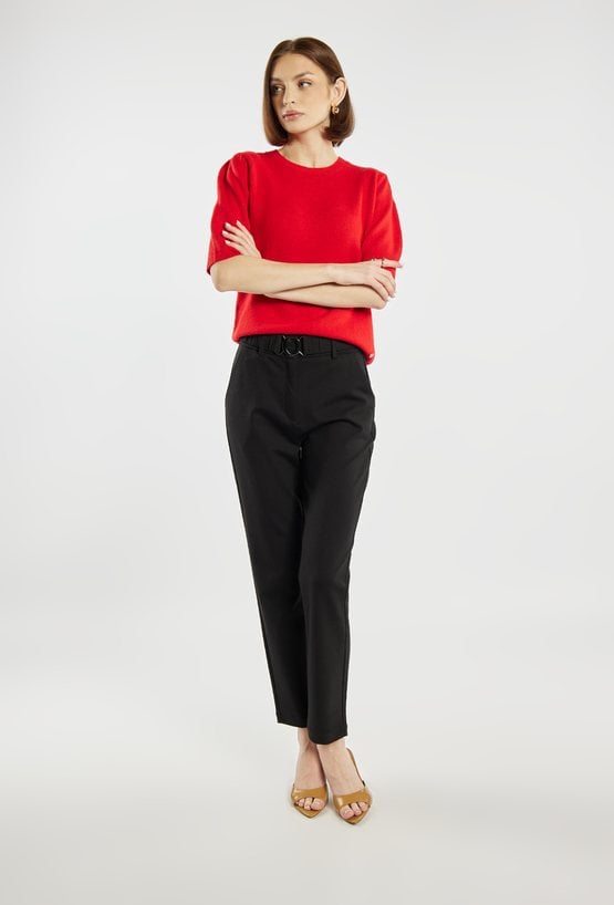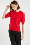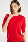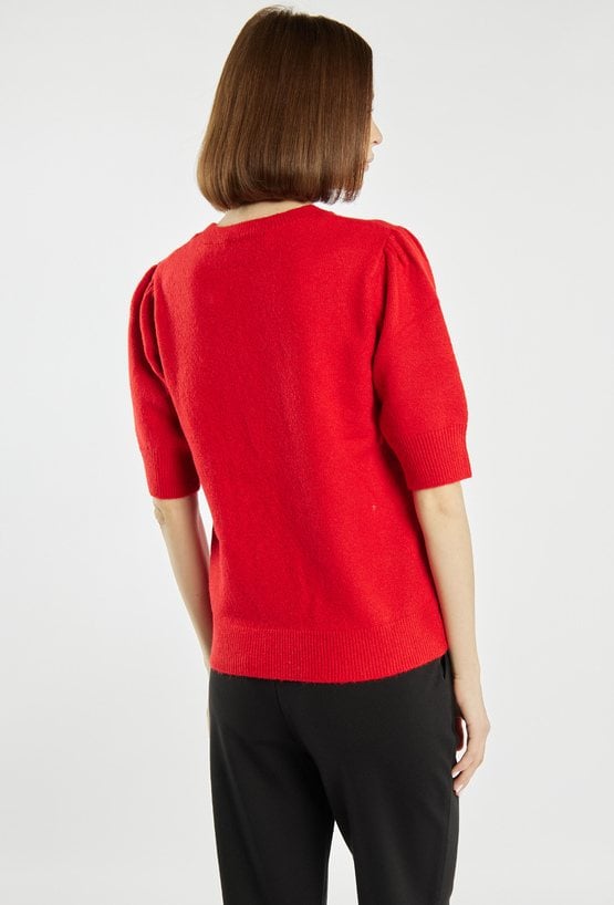 Sweter z krótkimi rękawami i półokrągłym dekoltem. Sweter wykonany z miękkiej, przyjemnej w dotyku dzianiny, o klasycznym kroju i subtelnie bufiastych rękawach, idealny na codzienne stylizacje. Modelka na zdjęciu ma 177 cm wzrostu i prezentuje rozmiar S.