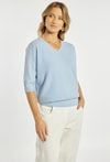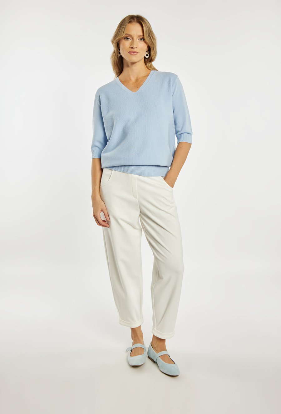 Sweter damski o klasycznym, ponadczasowym kroju. Model z rękawem o długości 3/4 oraz dekoltem w kształcie litery V, który subtelnie podkreśla linię szyi. Sweter doskonale sprawdzi się w codziennych stylizacjach. Modelka na zdjęciu ma 177 cm wzrostu i prezentuje rozmiar S/M.