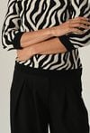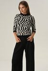 Postaw na modę i wygodę! Nasz sweter z miękkiej dzianiny z wysoką zawartością wiskozy zachwyca unikalnym printem oraz oryginalnym, półokrągłym dekoltem. Rękawy do łokcia dodają lekkości i idealnie sprawdzą się w cieplejsze dni. To must-have w Twojej garderobie, który podkreśli Twój styl i doda charakteru każdej stylizacji! Modelka na zdjęciu ma 177 cm wzrostu i prezentuje rozmiar 36/S.