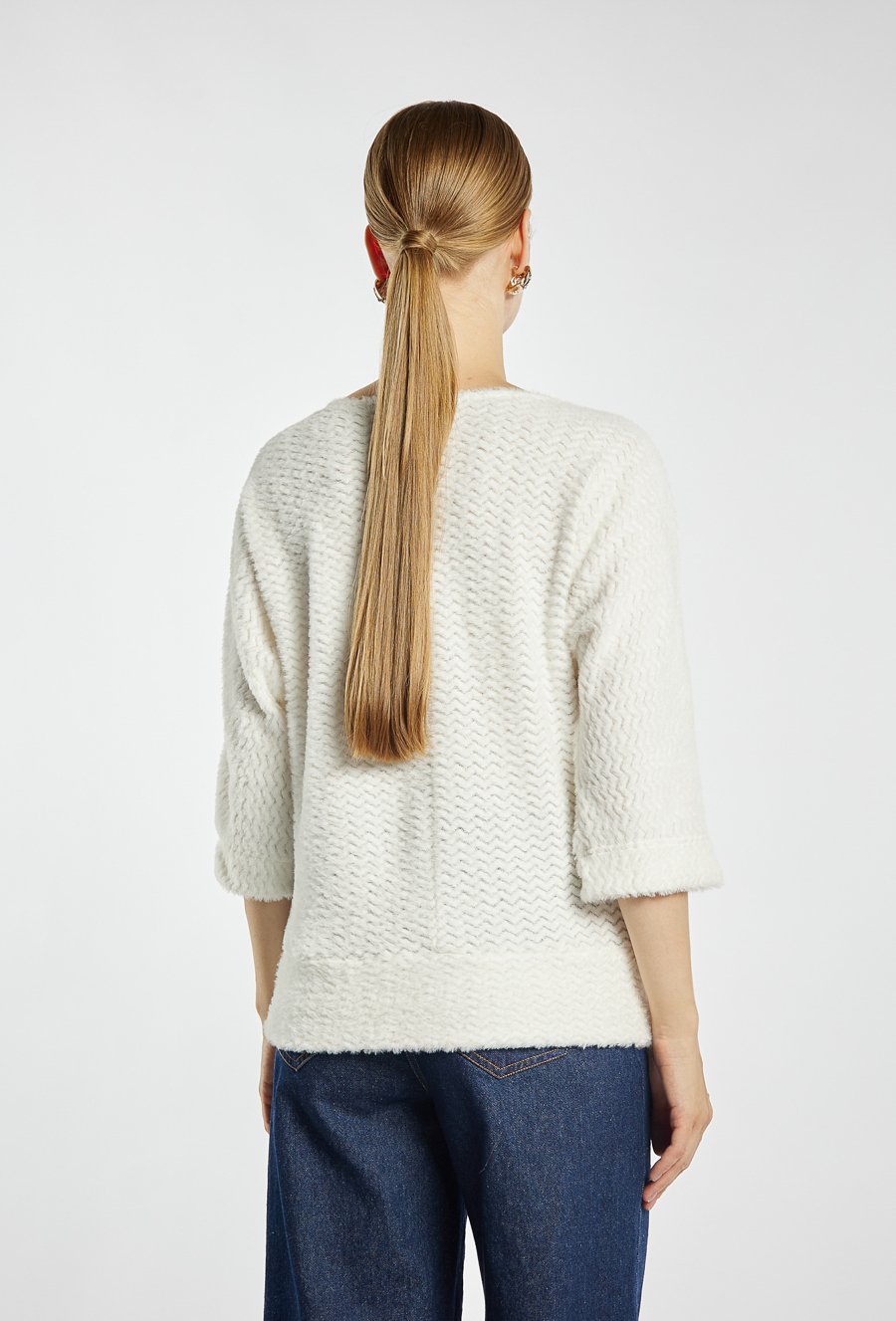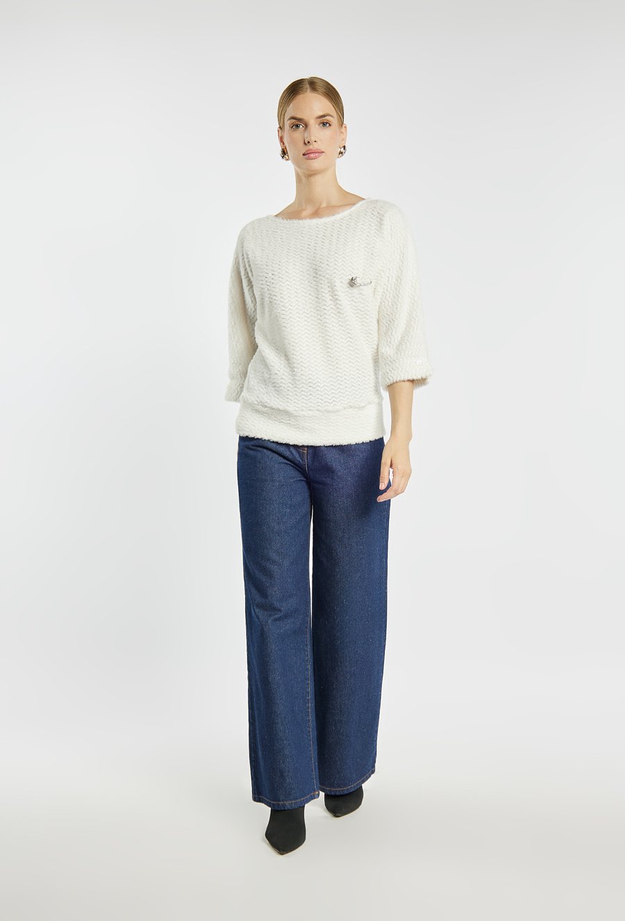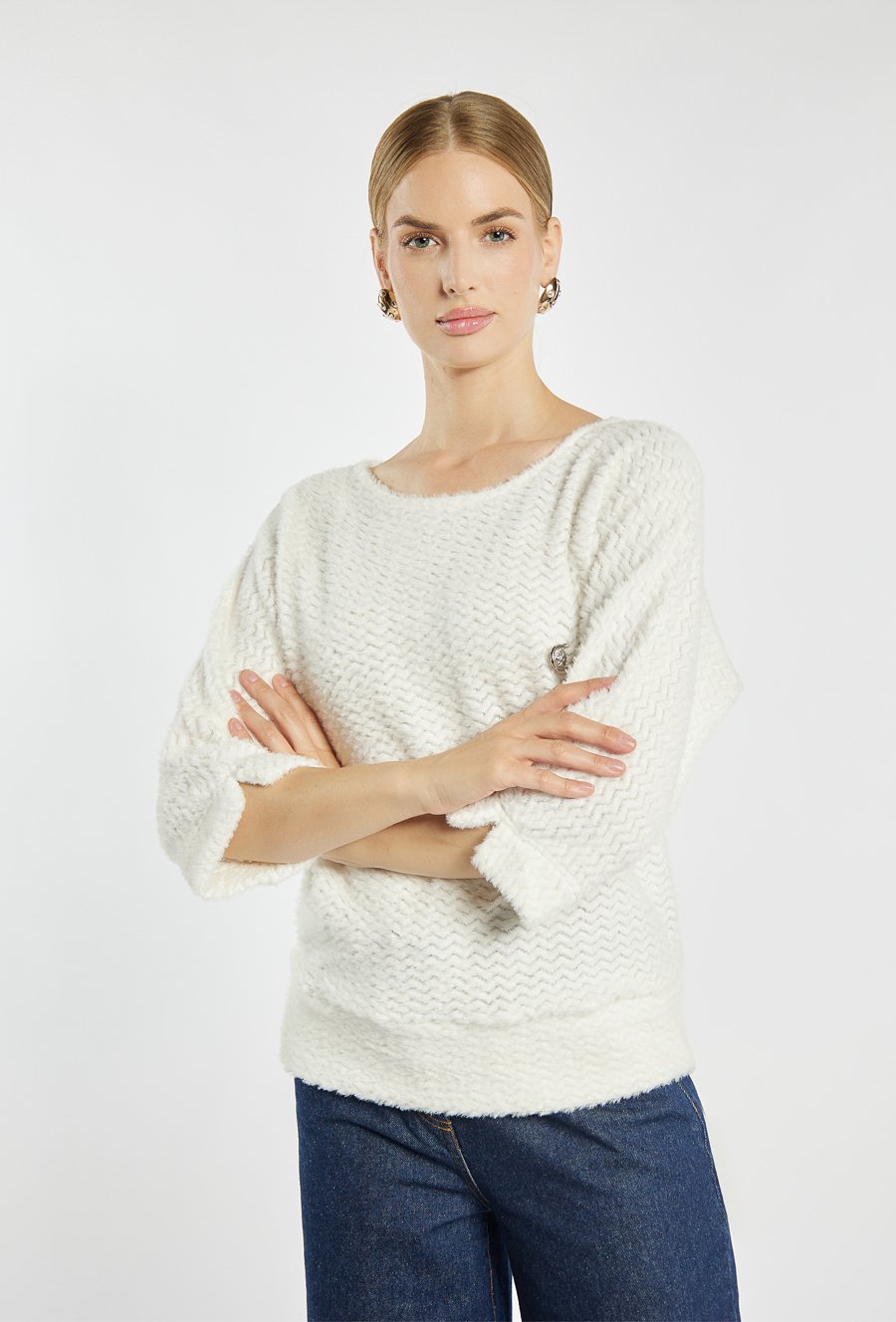 Sweter damski z subtelnym wzorem w jodełkę. Model z rękawem 3/4, wykończonym rozcięciem i guziczkiem, ozdobiony elegancką broszką w formie agrafki. Stylowy i wygodny wybór na co dzień. Modelka na zdjęciu ma 177 cm wzrostu i prezentuje rozmiar S.