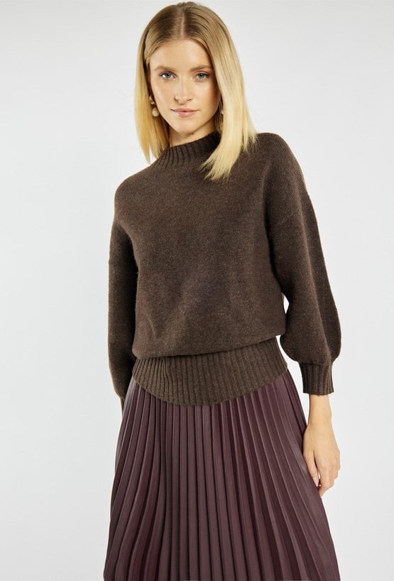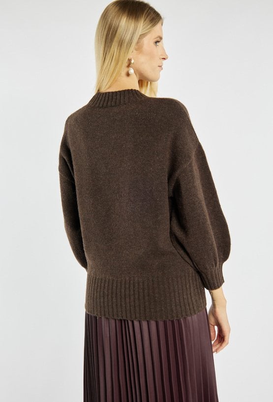 Sweter damski o klasycznym kroju. Sweter półgolfem oraz rękawami o długości 3/4 zakończonymi delikatnym ściągaczem. Szeroki ściągacz u dołu podkreśla sylwetkę i dodaje całości struktury. Uniwersalny fason sprawdzi się zarówno w stylizacjach codziennych, jak i eleganckich. Modelka na zdjęciu ma 177 cm wzrostu i prezentuje rozmiar S.