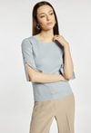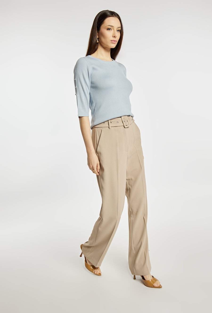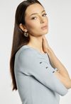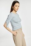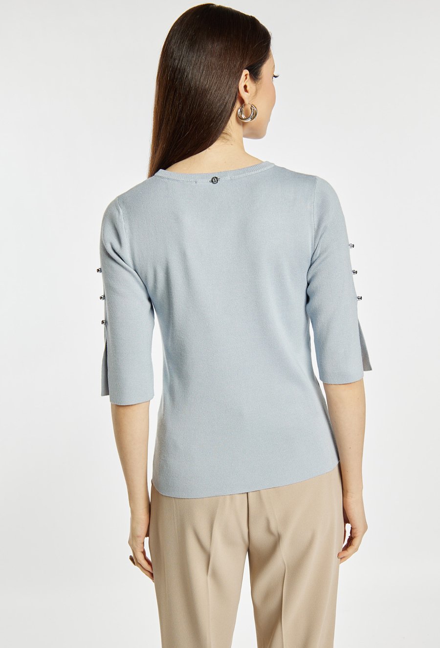 Sweter o klasycznym kroju z krótkim rękawem wyróżnia się dekoracyjnym rozcięciem na rękawach, ozdobionym subtelnymi guzikami. Model idealny na wiosnę, świetnie sprawdzi się zarówno w eleganckich, jak i codziennych stylizacjach. Modelka na zdjęciu ma 177 cm wzrostu i prezentuje rozmiar S.