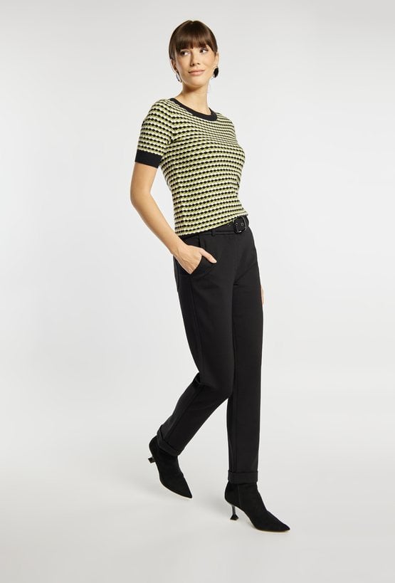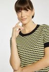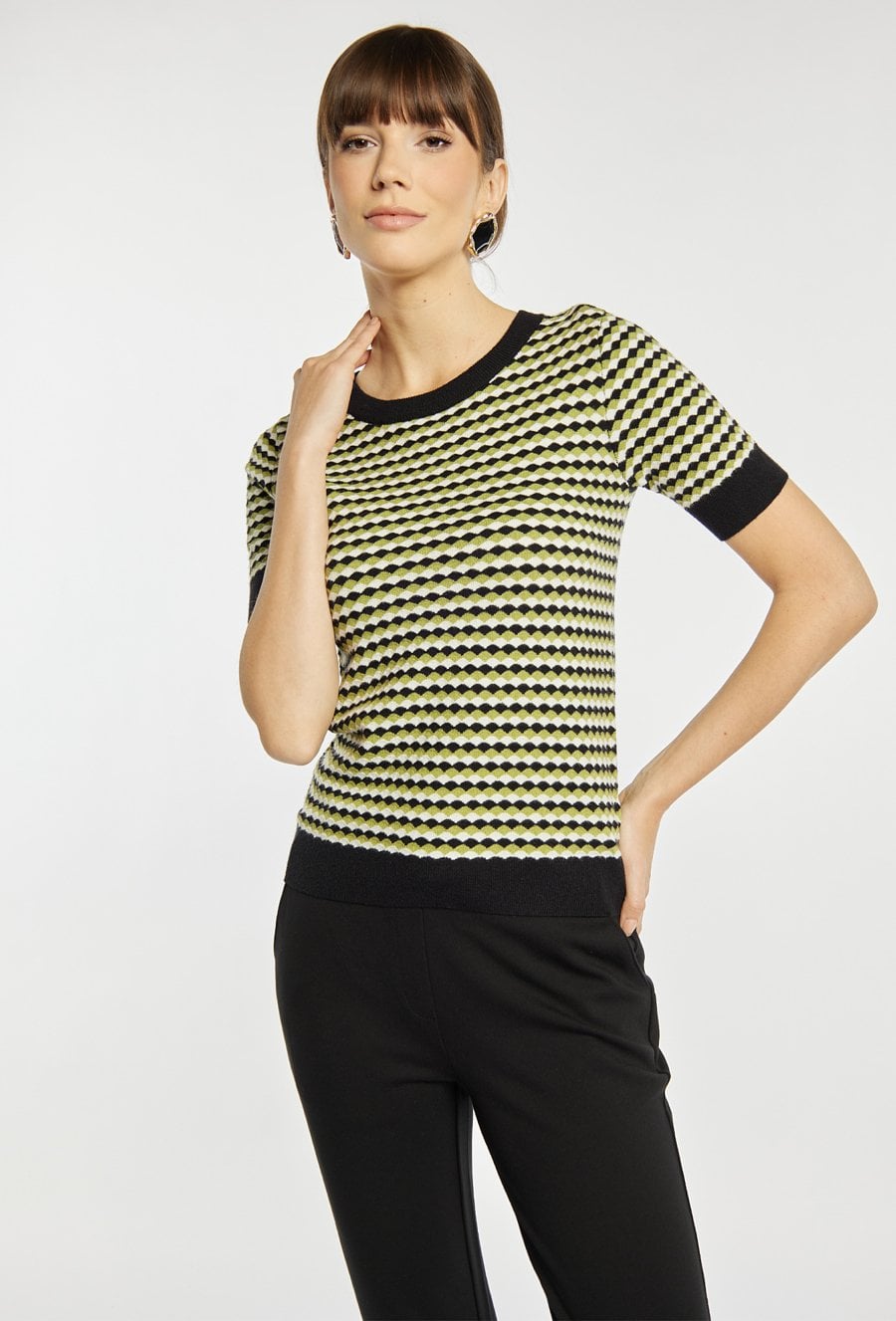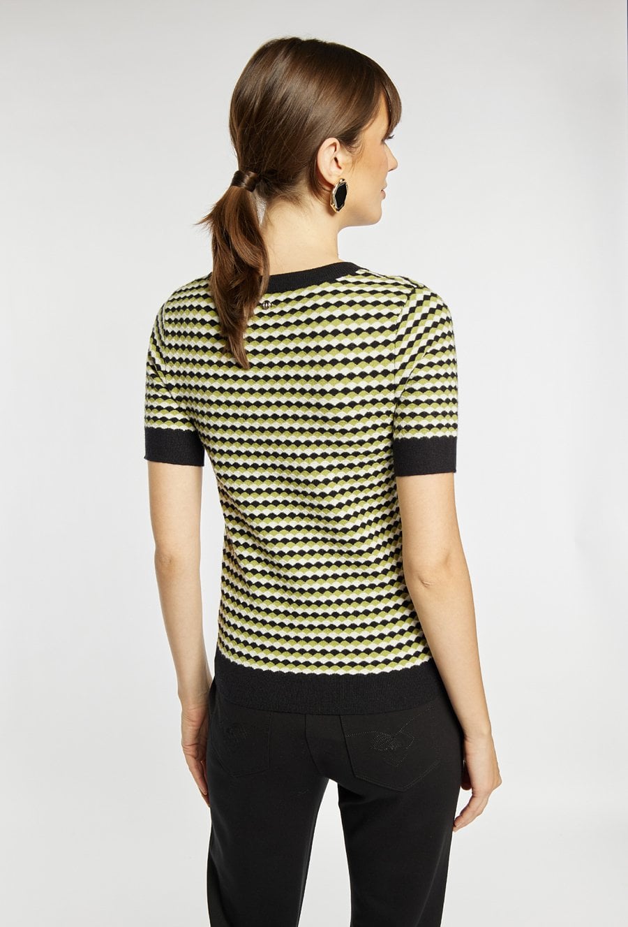 Sweter o krótkim rękawie z geometrycznym wzorem, który nadaje stylizacji nowoczesny charakter. Świetna propozycja na co dzień- wygodna, lekka i łatwa do łączenia z jeansami lub spódnicą. Modelka na zdjęciu ma 177 cm wzrostu i prezentuje rozmiar S.