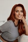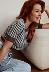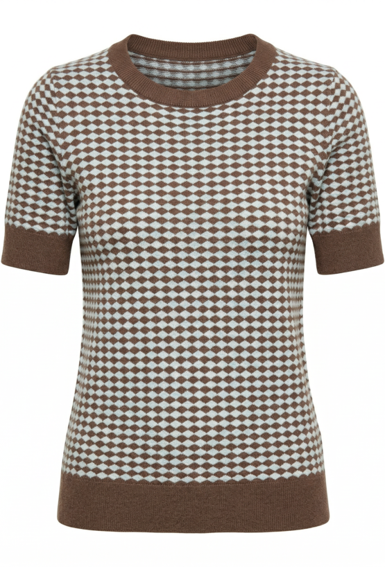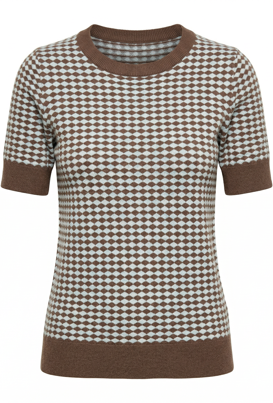 Sweter o krótkim rękawie z geometrycznym wzorem, który nadaje stylizacji nowoczesny charakter. Świetna propozycja na co dzień- wygodna, lekka i łatwa do łączenia z jeansami lub spódnicą. Modelka na zdjęciu ma 177 cm wzrostu i prezentuje rozmiar S.