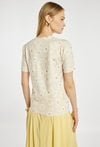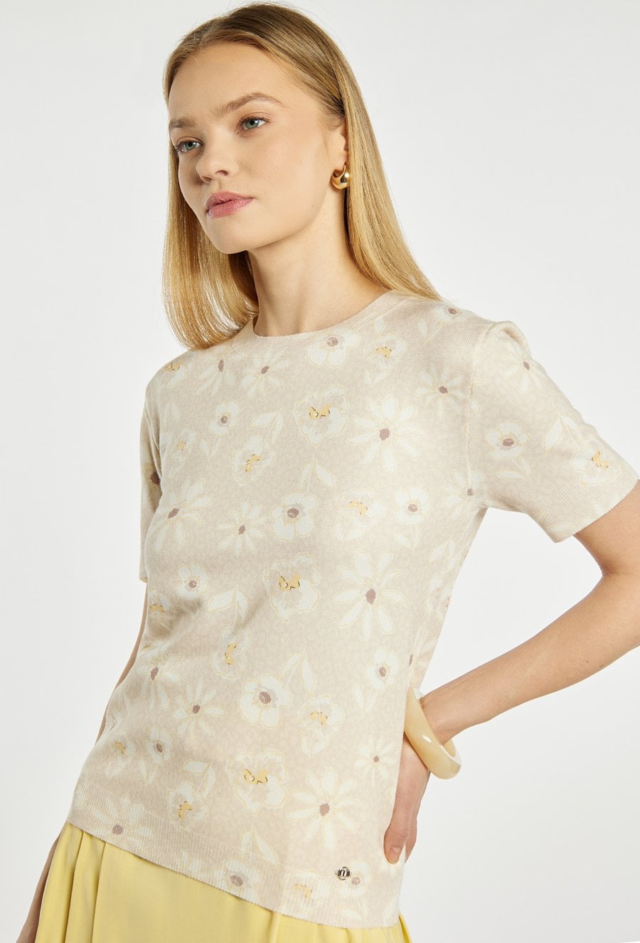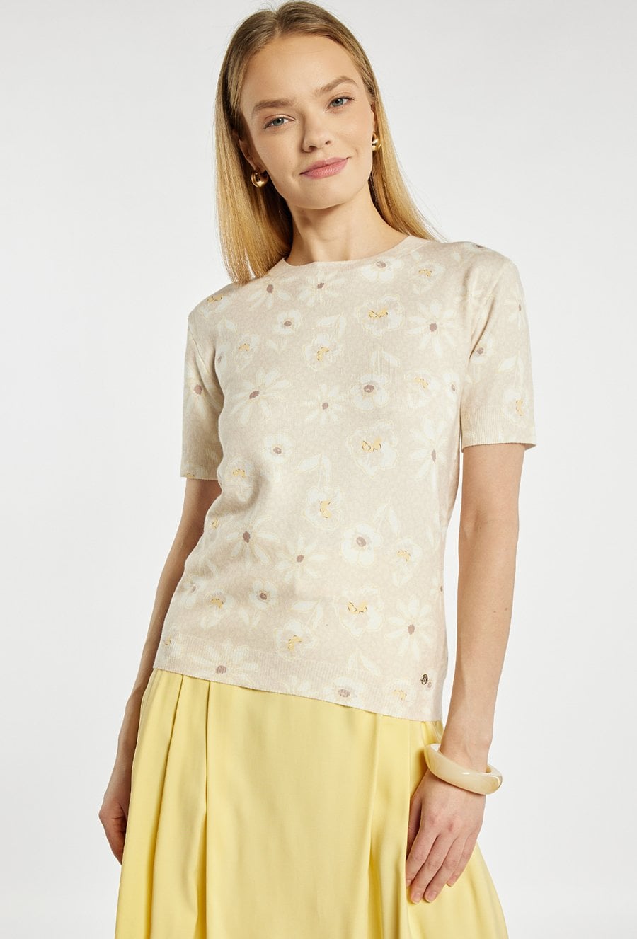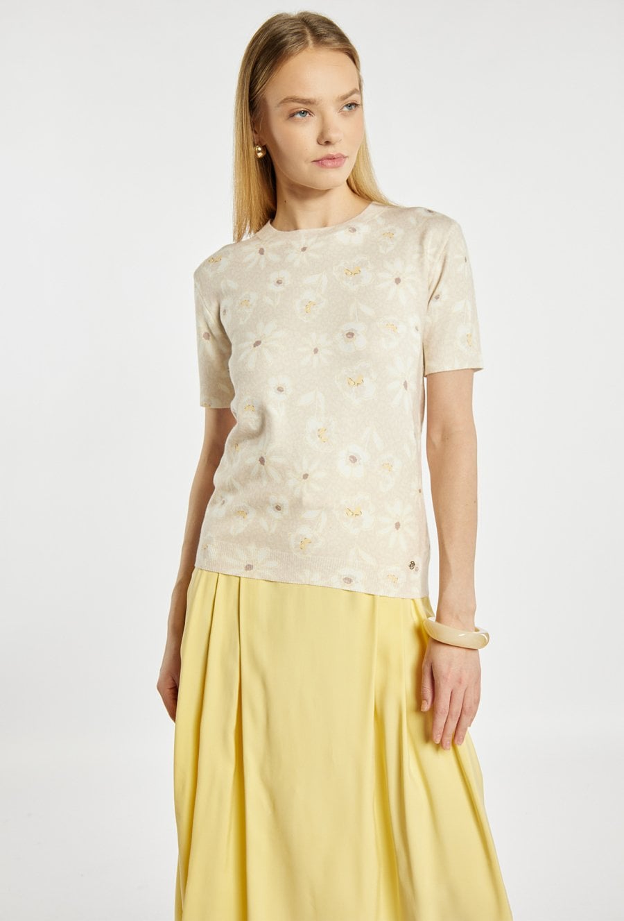 Lekki sweter o prostym, klasycznym kroju. Model z krótkim rękawem i okrągłym dekoltem, ozdobiony subtelnym wzorem. Sweter świetnie sprawdzi się w codziennych stylizacjach oraz w bardziej eleganckim wydaniu. Modelka na zdjęciu ma 177 cm wzrostu i prezentuje rozmiar S.