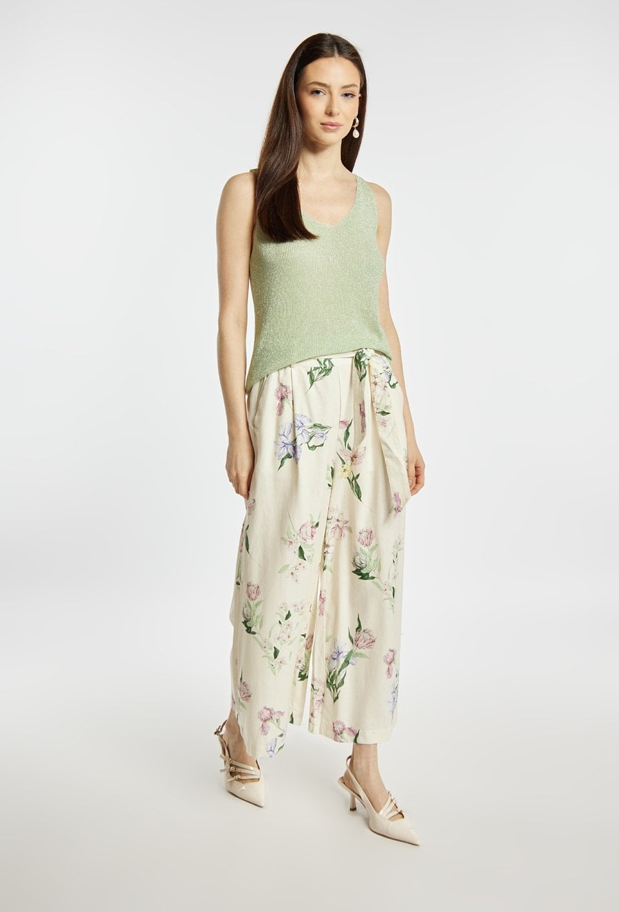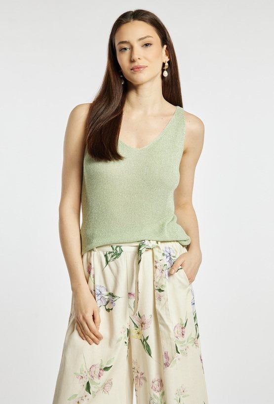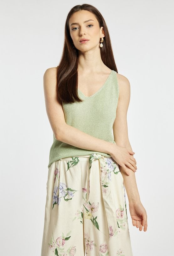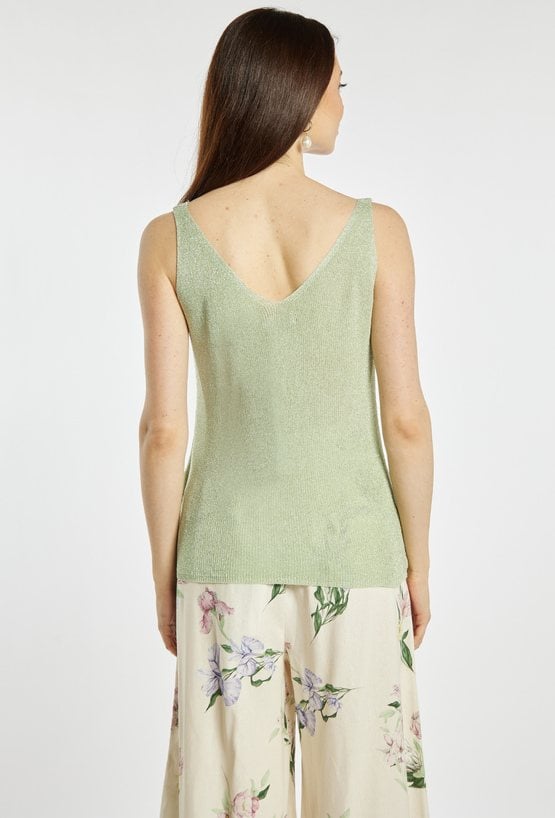 Top damski o dopasowanym, eleganckim kroju. Model na cienkich ramiączkach z dekoltem w kształcie litery V, który subtelnie podkreśla linię szyi i ramion. Dzianina o delikatnym połysku nadaje całości efektownego, wieczorowego charakteru. Sweterkowy top damski doskonale sprawdzi się w stylizacjach eleganckich oraz wieczorowych. modelka na zdjęciu ma 177 cm wzrostu i prezentuje rozmiar S/M.