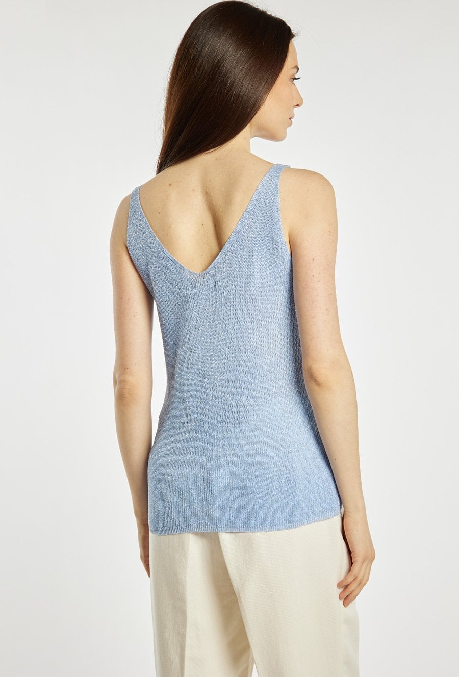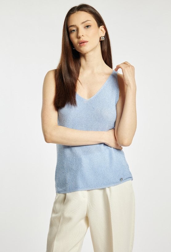 Top damski o dopasowanym, eleganckim kroju. Model na cienkich ramiączkach z dekoltem w kształcie litery V, który subtelnie podkreśla linię szyi i ramion. Dzianina o delikatnym połysku nadaje całości efektownego, wieczorowego charakteru. Sweterkowy top damski doskonale sprawdzi się w stylizacjach eleganckich oraz wieczorowych. modelka na zdjęciu ma 177 cm wzrostu i prezentuje rozmiar S/M.