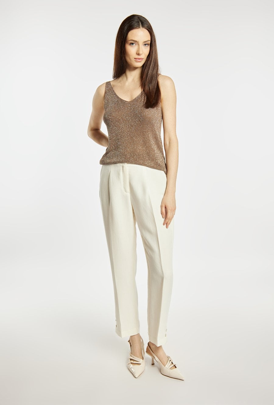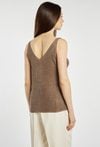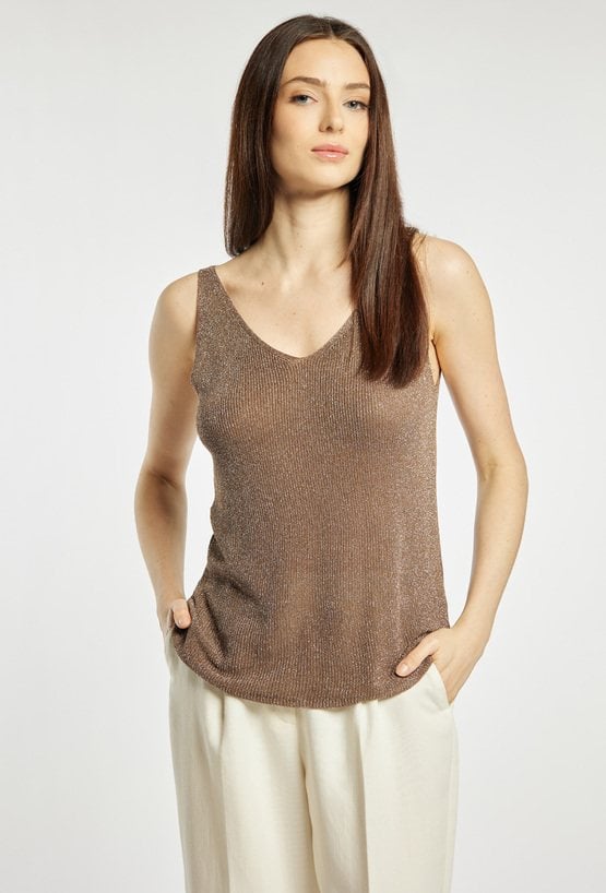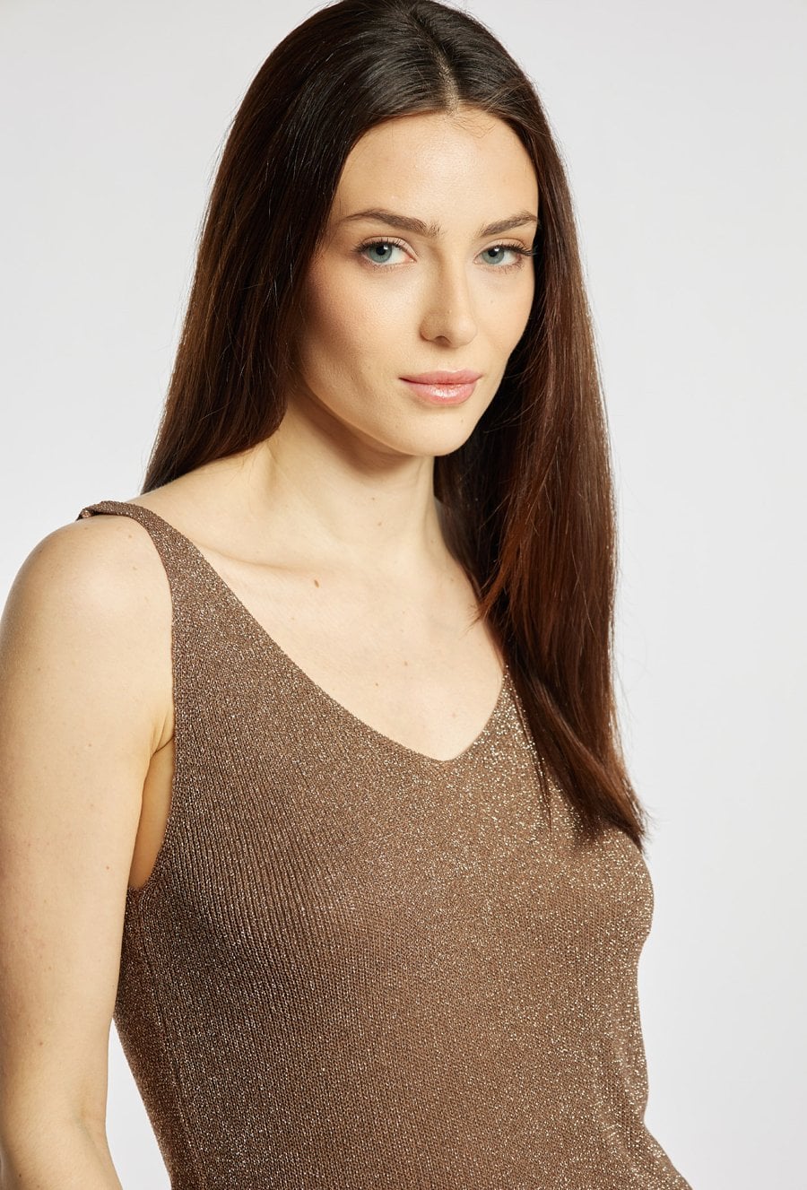 Top damski o dopasowanym, eleganckim kroju. Model na cienkich ramiączkach z dekoltem w kształcie litery V, który subtelnie podkreśla linię szyi i ramion. Dzianina o delikatnym połysku nadaje całości efektownego, wieczorowego charakteru. Sweterkowy top damski doskonale sprawdzi się w stylizacjach eleganckich oraz wieczorowych. modelka na zdjęciu ma 177 cm wzrostu i prezentuje rozmiar S/M.