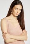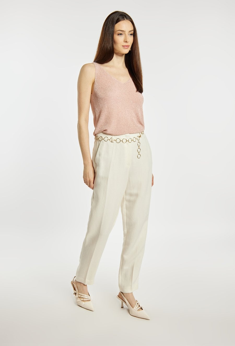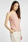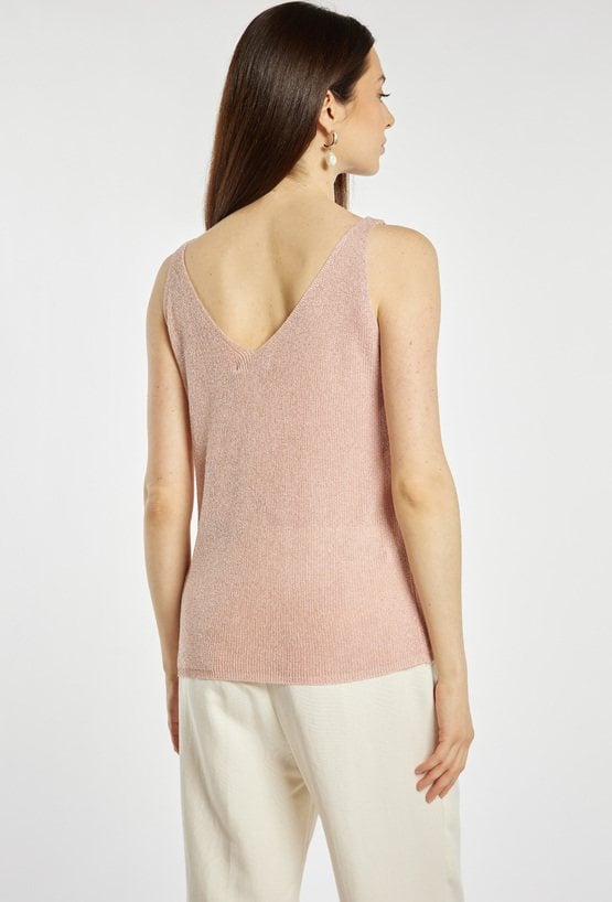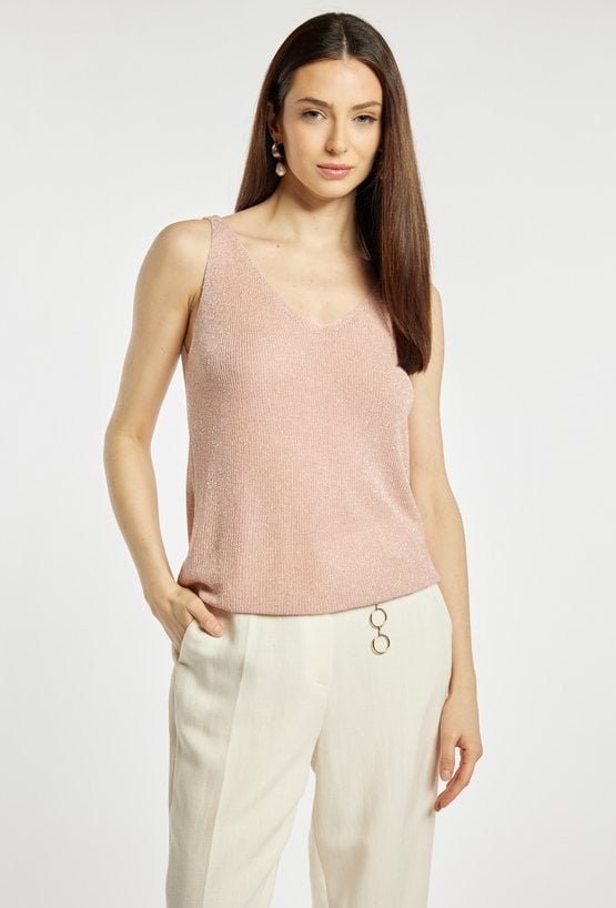 Top damski o dopasowanym, eleganckim kroju. Model na cienkich ramiączkach z dekoltem w kształcie litery V, który subtelnie podkreśla linię szyi i ramion. Dzianina o delikatnym połysku nadaje całości efektownego, wieczorowego charakteru. Sweterkowy top damski doskonale sprawdzi się w stylizacjach eleganckich oraz wieczorowych. modelka na zdjęciu ma 177 cm wzrostu i prezentuje rozmiar S/M.