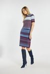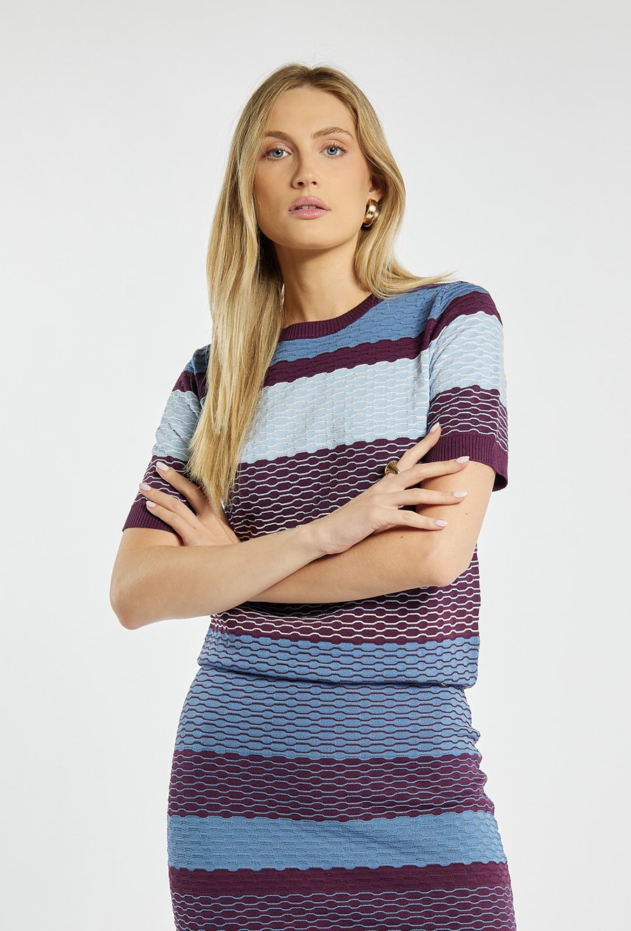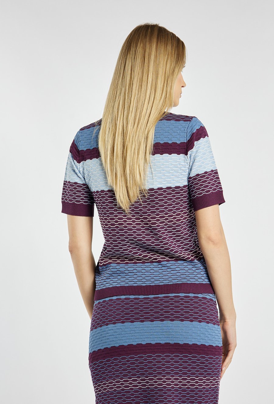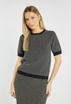 Sweter damski z krótkim rękawem. Sweter z okrągłym dekoltem i wykończeniami w kontrastowym ściągaczu przy rękawach, dole i pod szyją. Dopasowany fason podkreśla sylwetkę. Modelka na zdjęciu ma 177 cm wzrostu i prezentuje rozmiar S. Polecamy zestawić z pasującym dołem: 25J-SKR0740.