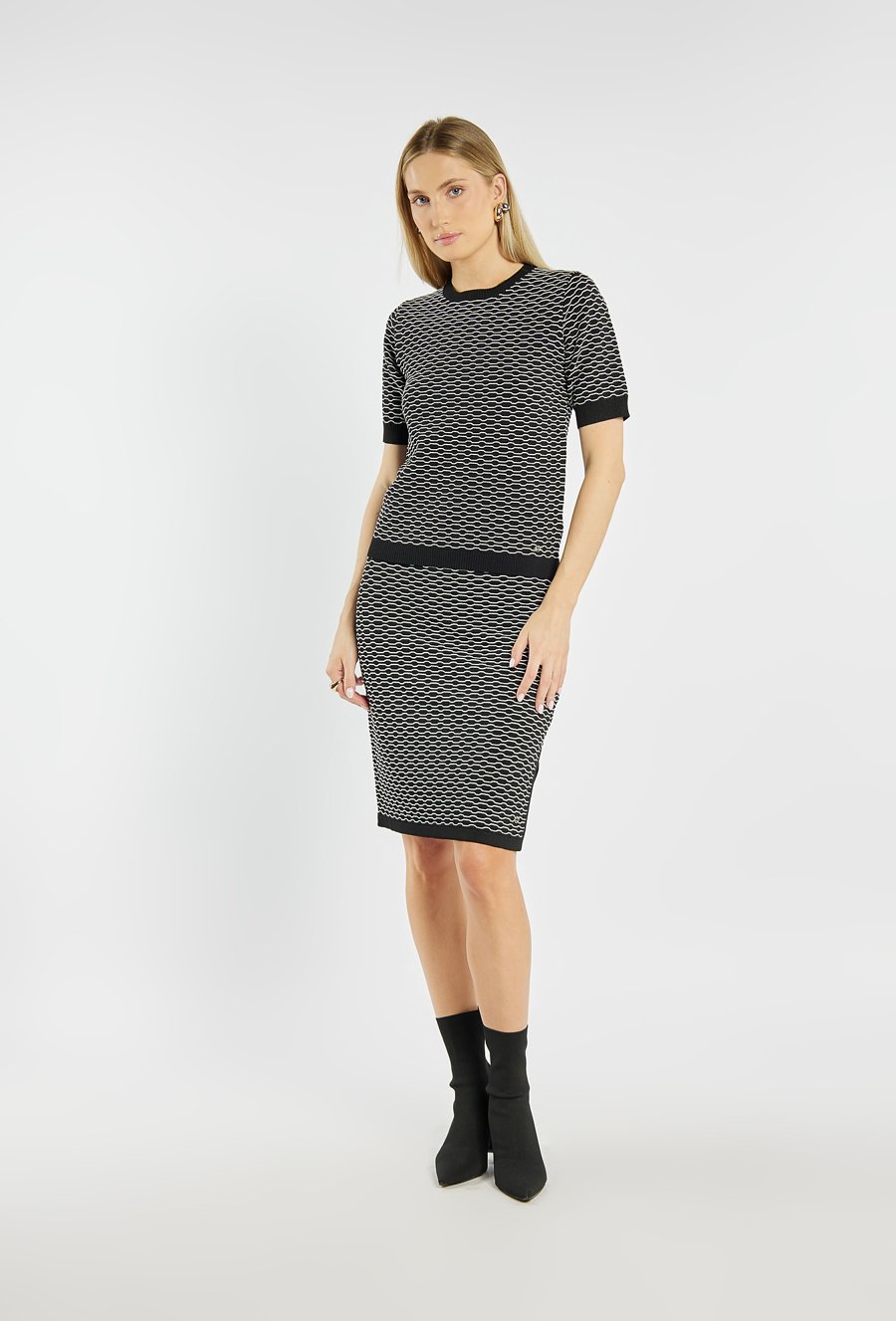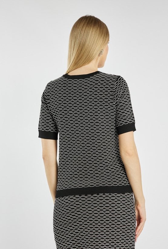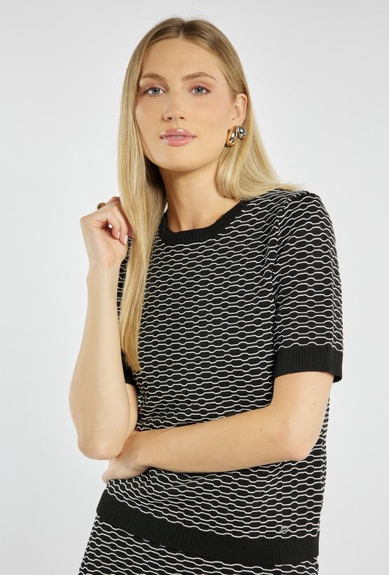 Sweter damski z krótkim rękawem. Sweter z okrągłym dekoltem i wykończeniami w kontrastowym ściągaczu przy rękawach, dole i pod szyją. Dopasowany fason podkreśla sylwetkę. Modelka na zdjęciu ma 177 cm wzrostu i prezentuje rozmiar S. Polecamy zestawić z pasującym dołem: 25J-SKR0740.