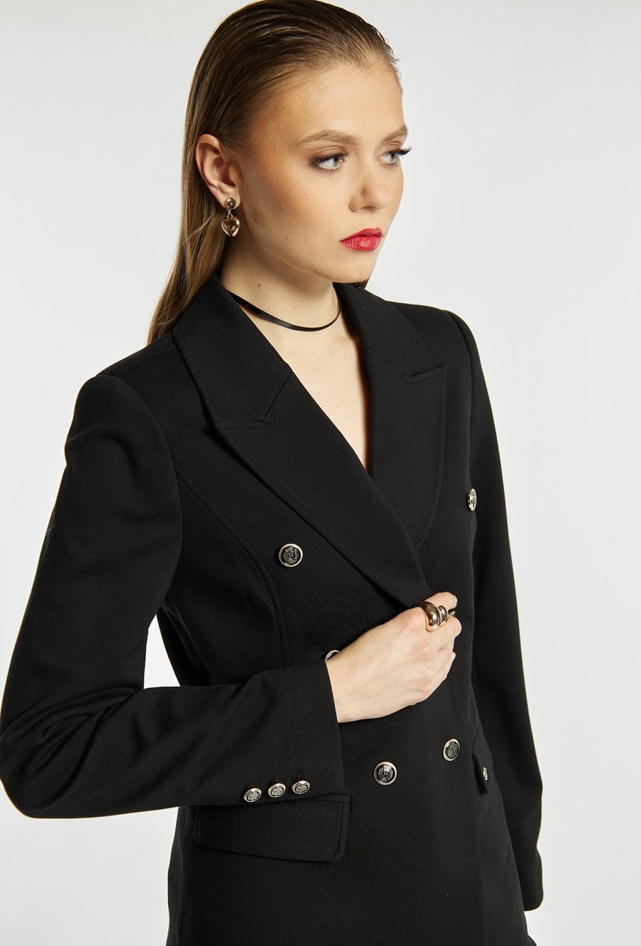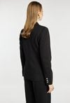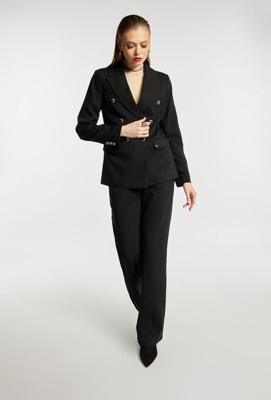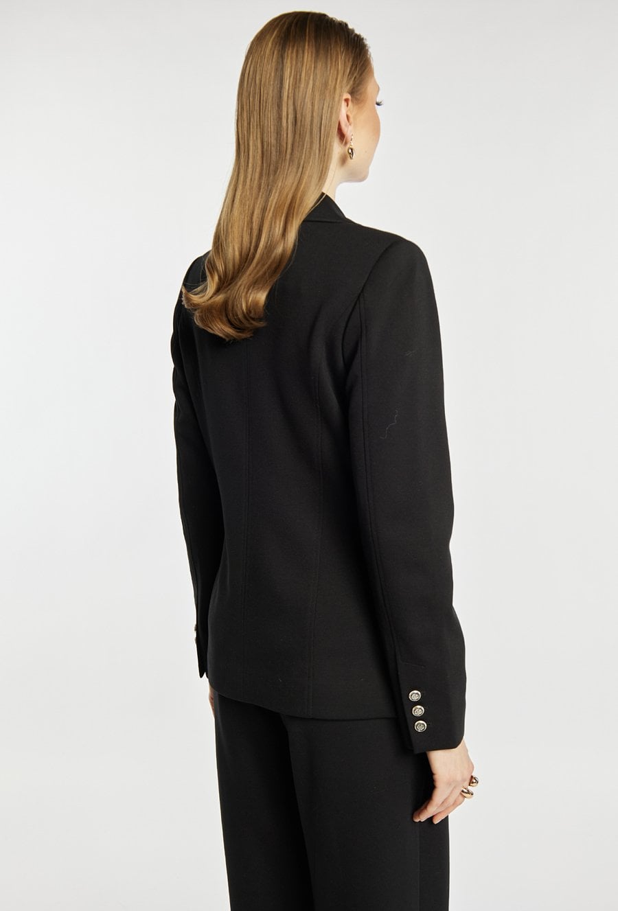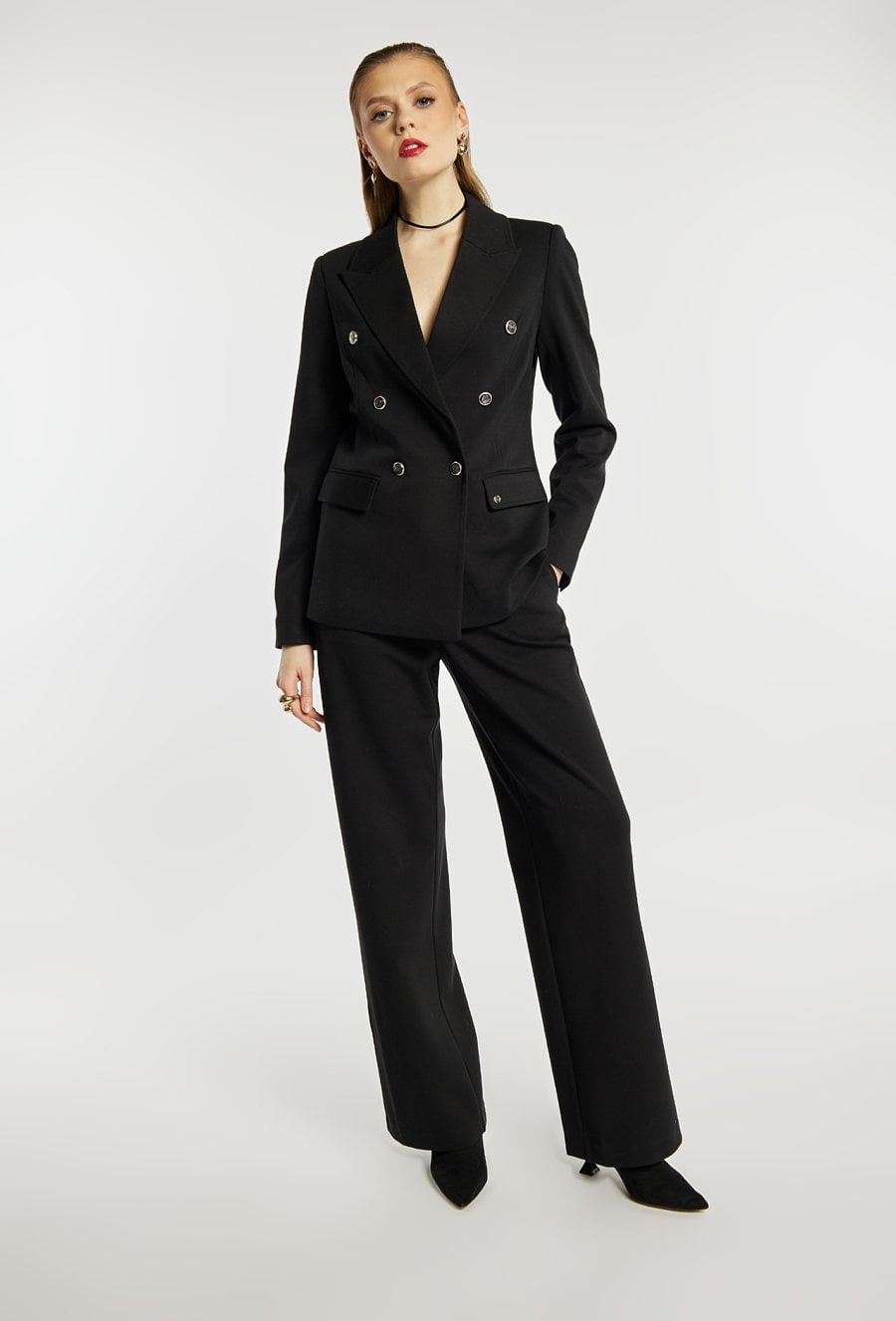 Marynarka damska o klasycznym, dwurzędowym kroju. Marynarka z wyrazistymi klapami i ozdobnymi guzikami ma konstrukcję dwurzędową, jednak zapinana jest na jeden guzik, co nadaje jej nowoczesny i lekko minimalistyczny charakter. Czarny kolor dodaje stylizacjom szyku. Model doskonale prezentuje się w zestawie ze spodniami. Kod do spodni: 26W-TRU0530-K020.