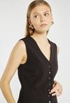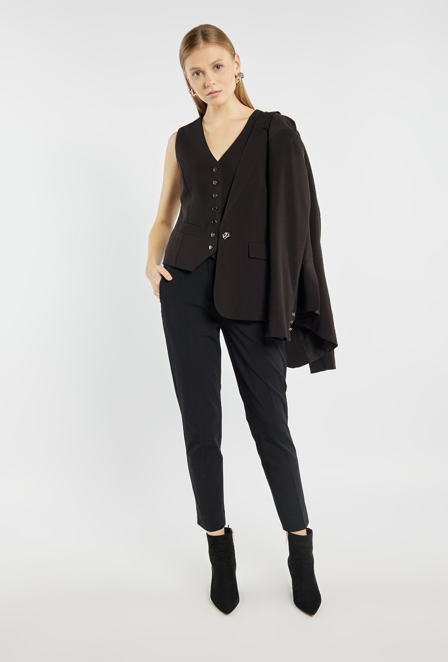 Elegancka kamizelka zapinana na rząd guzików, o lekko taliowanym kroju, który pięknie podkreśla sylwetkę. Minimalistyczny fason sprawia, że świetnie prezentuje się zarówno solo, jak i w komplecie z marynarką oraz spodniami w tym samym stylu. Kod do marynarki: 25J-BZR0621 i spodni: 25J-TRU2191. Modelka na zdjęciu ma 177 cm wzrostu i prezentuje rozmiar 36.