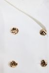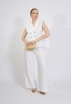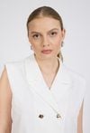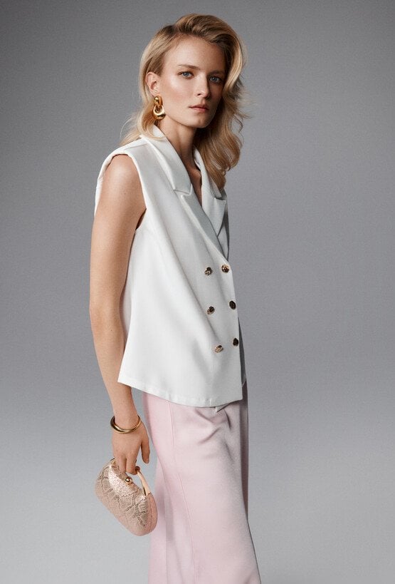 Elegancka kamizelka damska o klasycznym, dopasowanym kroju. Model bez rękawów z kołnierzem z klapami oraz dwurzędowym zapięciem na ozdobne guziki, które podkreślają jej elegancki charakter. Prosty fason sprawia, że kamizelka doskonale układa się na sylwetce i stanowi stylowy element garderoby. Modelka na zdjęciu ma 177 cm wzrostu i prezentuje rozmiar 36.