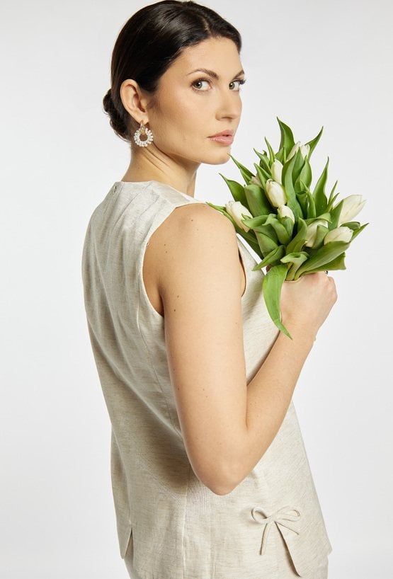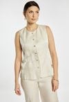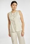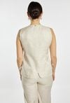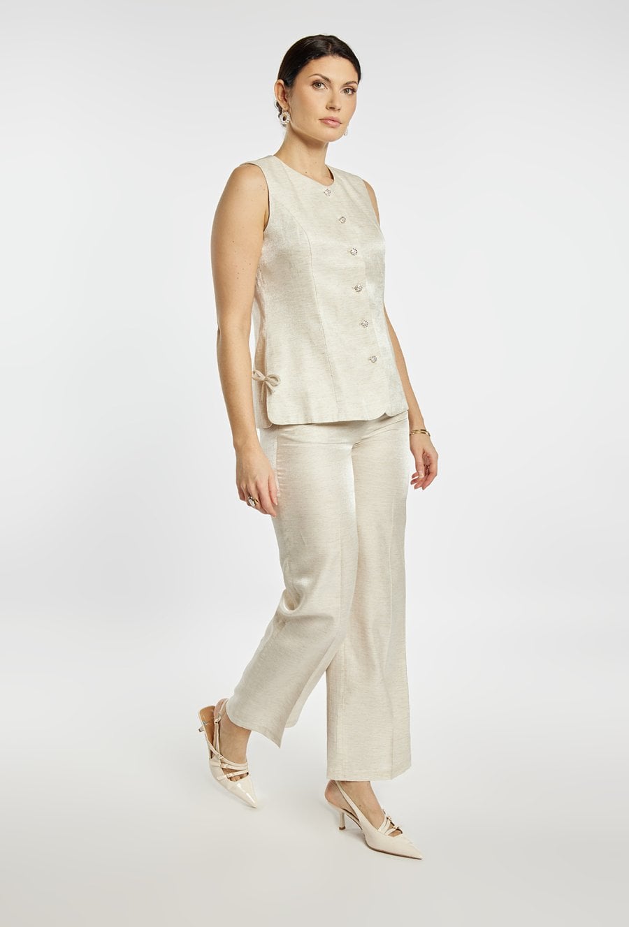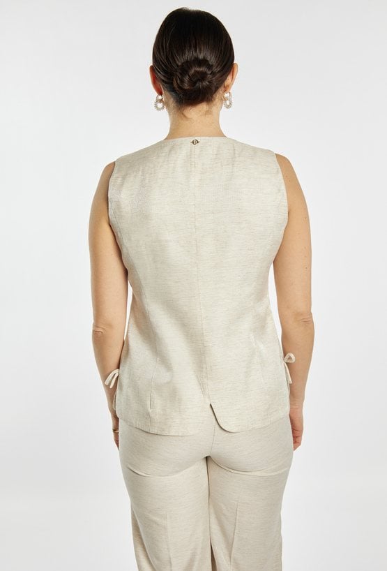 Elegancka kamizelka damska o dopasowanym kroju bez rękawów. Model zapinany na ozdobne guziki, wykonany z materiału o efektownym wykończeniu. Kamizelkę można zestawić z marynarką oraz spodniami, tworząc stylowy i elegancki komplet. Kody do kompletów: