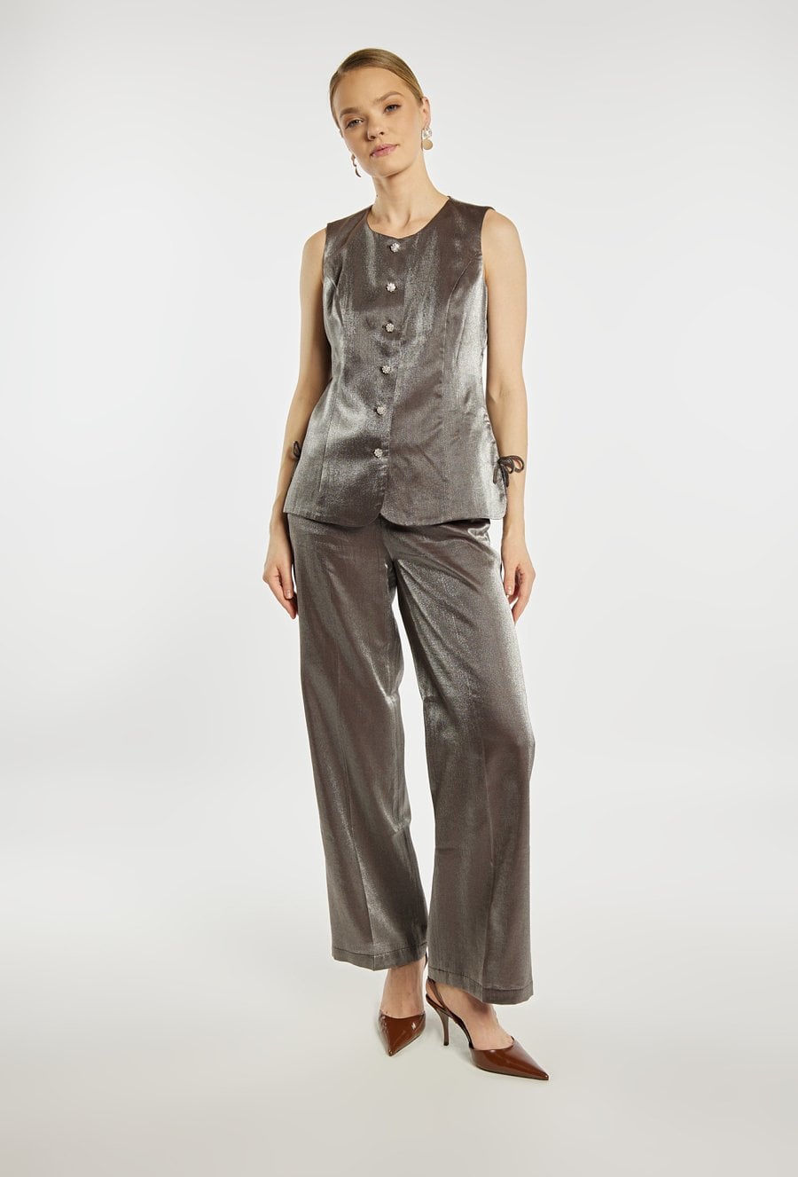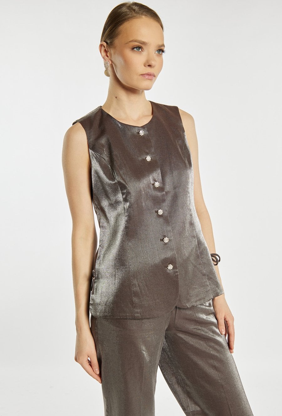 Elegancka kamizelka damska o dopasowanym kroju bez rękawów. Model zapinany na ozdobne guziki, wykonany z materiału o efektownym wykończeniu. Kamizelkę można zestawić z marynarką oraz spodniami, tworząc stylowy i elegancki komplet. Kody do kompletów: