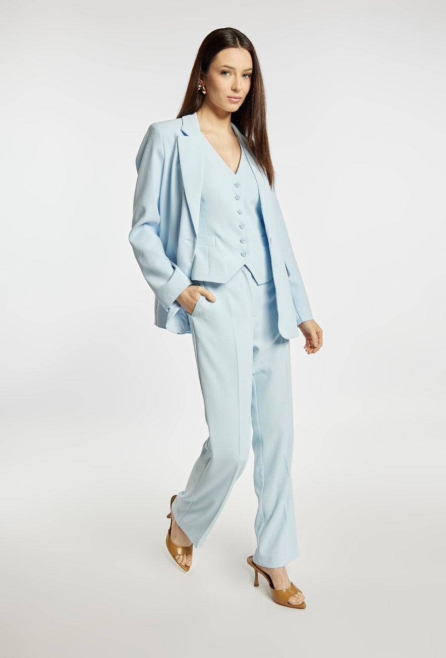 Elegancka kamizelka tkaninowa o dopasowanym, klasycznym kroju. Model bez rękawów, z dekoltem w kształcie litery V i zapinaniem na guziki, które podkreślają jej formalny charakter. Przód wykonany z gładkiej tkaniny, tył z kontrastowego materiału o subtelnym, zwierzęcym wzorze, co dodaje całości nowoczesnego akcentu. Kamizelka ładnie układa się na sylwetce i sprawdzi się zarówno w stylizacjach biurowych, jak i bardziej eleganckich zestawach. Kod do marynarki; 26W-BZR0180; kod do spodni: 26W-TRU0950. Modelka na zdjęciu ma 177 cm wzrostu i prezentuje rozmiar 36.