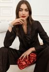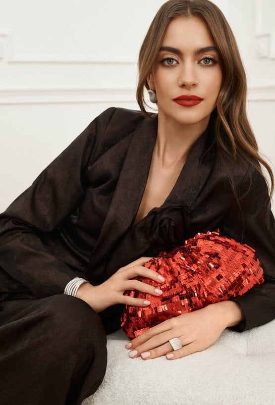 Elegancka marynarka damska o lekko taliowanym kroju. Model zapinany na jeden guzik, z klasycznym kołnierzem i kieszeniami z klapkami. Ozdobiona efektowną różą 3D przypinaną na agrafkę, którą można odpiąć. Marynarka o subtelnym, metalicznym połysku. Polecamy zestawić z pasującymi spodniami. Kod do spodni: 25Z-TRU3390. Modelka na zdjęciu ma 177 cm wzrostu i prezentuje rozmiar 36.