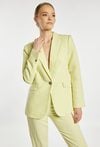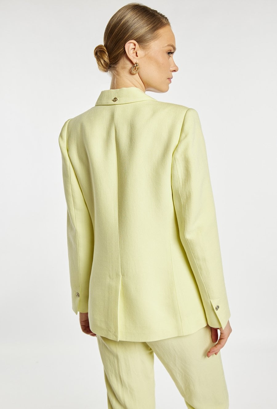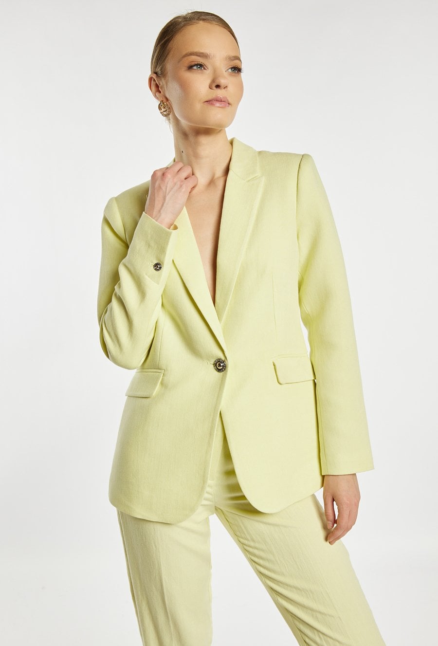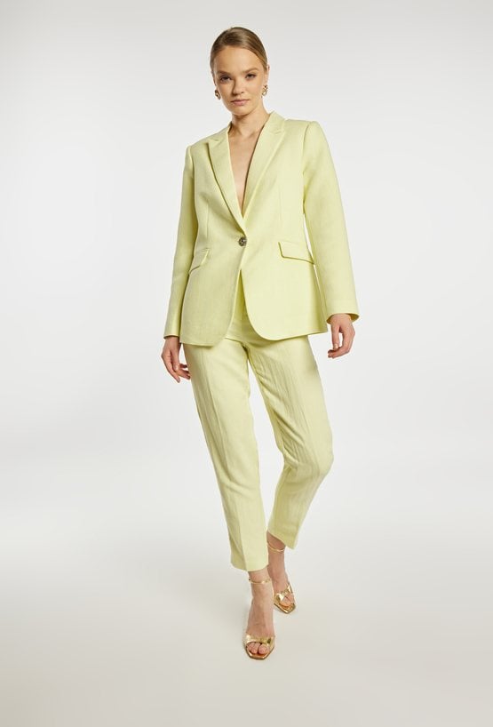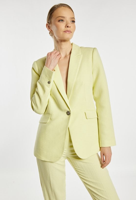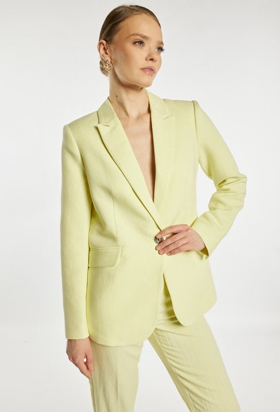Elegancka marynarka damska o klasycznym kroju z długim rękawem. Model z kołnierzem i klapami, zapinany na guzik, który podkreśla ponadczasowy charakter stylizacji. Marynarka doskonale sprawdzi się w eleganckich i biznesowych stylizacjach, do pracy oraz na różne uroczystości. Polecamy zestawić z pasującymi spodniami z tej samej kolekcji. Kod do spodni: 26L-TRU1020. Modelka na zdjęciu ma 177 cm wzrostu i prezentuje rozmiar 36.