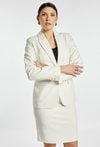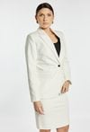 Elegancka marynarka damska o klasycznym kroju z długim rękawem. Model zapinany na guzik z kołnierzem i klapami, ozdobiony subtelnym detalem przy kieszeni. Marynarka doskonale sprawdzi się w stylizacjach biznesowych, do pracy oraz na eleganckie spotkania. Modelka na zdjęciu ma 177 cm wzrostu i prezentuje rozmiar 36.