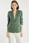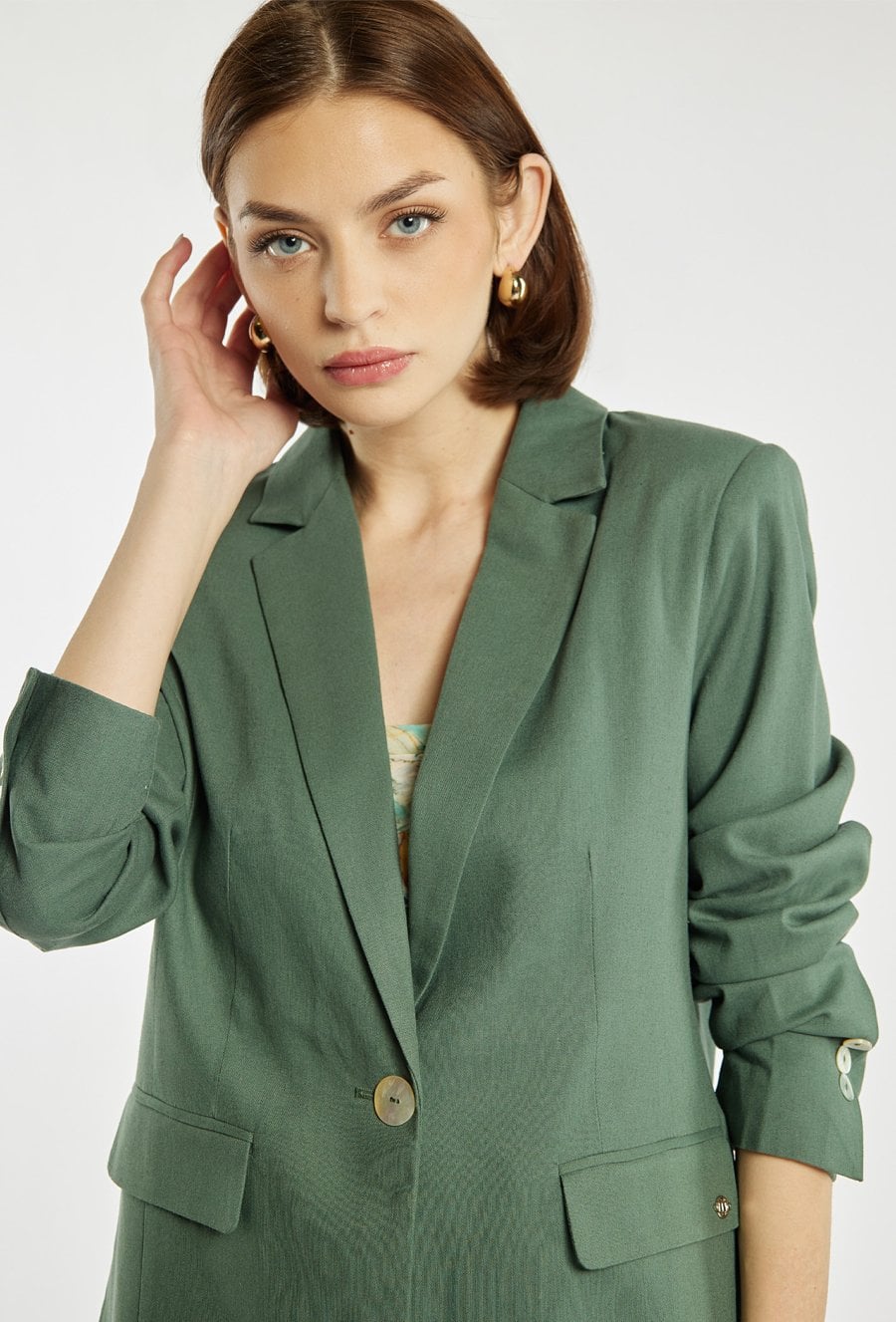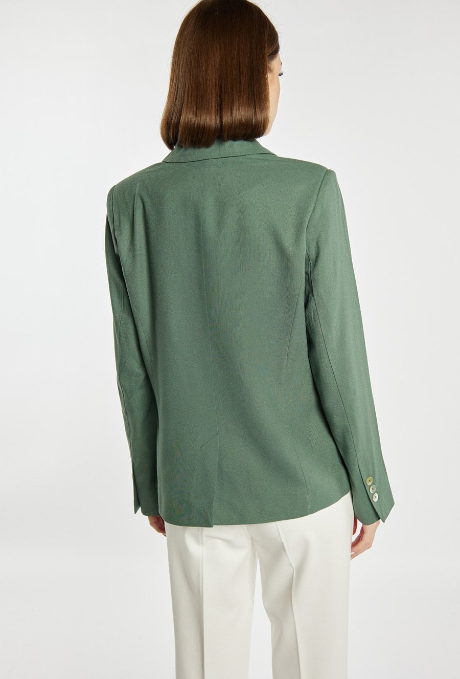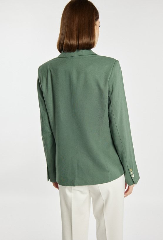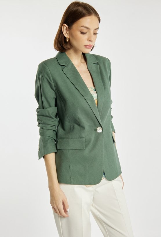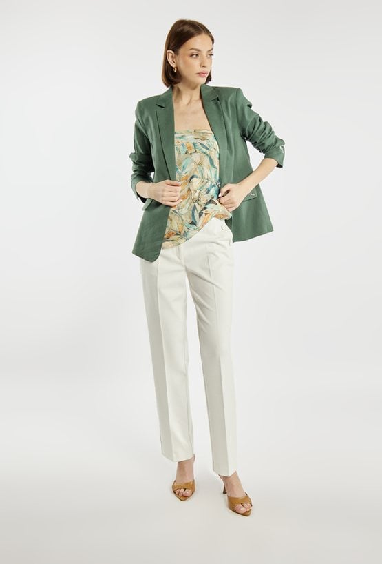 Elegancka marynarka damska o klasycznym kroju z długim rękawem. Model zapinany na guzik z kołnierzem i klapami, który nadaje stylizacji ponadczasowego charakteru. Marynarkę można zestawić z pasującymi spodniami, tworząc stylowy i elegancki komplet. Kod do spodni: 26L-TRU1540. Modelka na zdjęciu ma 177 cm wzrostu i prezentuje rozmiar 36.