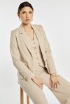 Marynarka damska o eleganckim, dopasowanym kroju. Model z klasycznymi klapami i zapięciem na guziki, który ładnie podkreśla sylwetkę i sprawdzi się zarówno w stylizacjach biurowych, jak i bardziej formalnych. Marynarka prezentuje się wyjątkowo stylowo w komplecie. Kod do spodni: 26W-TRU0720, kod do kamizelki: 26W- BZR0120. Modelka na zdjęciu ma 177 cm wzrostu i prezentuje rozmiar 36.