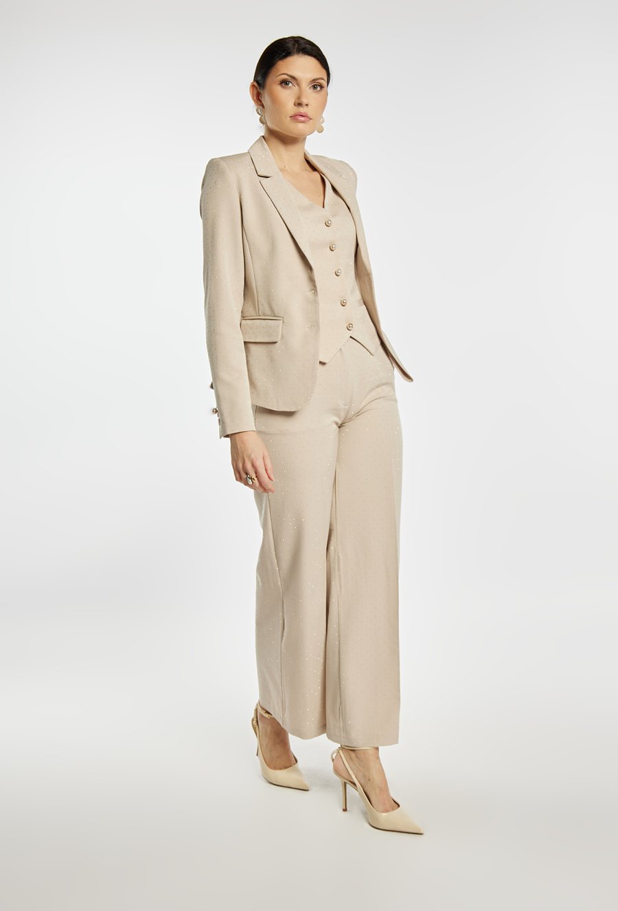MATERIAŁ GŁÓWNY: 79% POLIESTER, 18% WISKOZA, 3% ELASTAN; PODSZEWKA: 95% POLIESTER, 5% ELASTAN