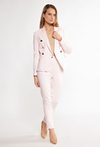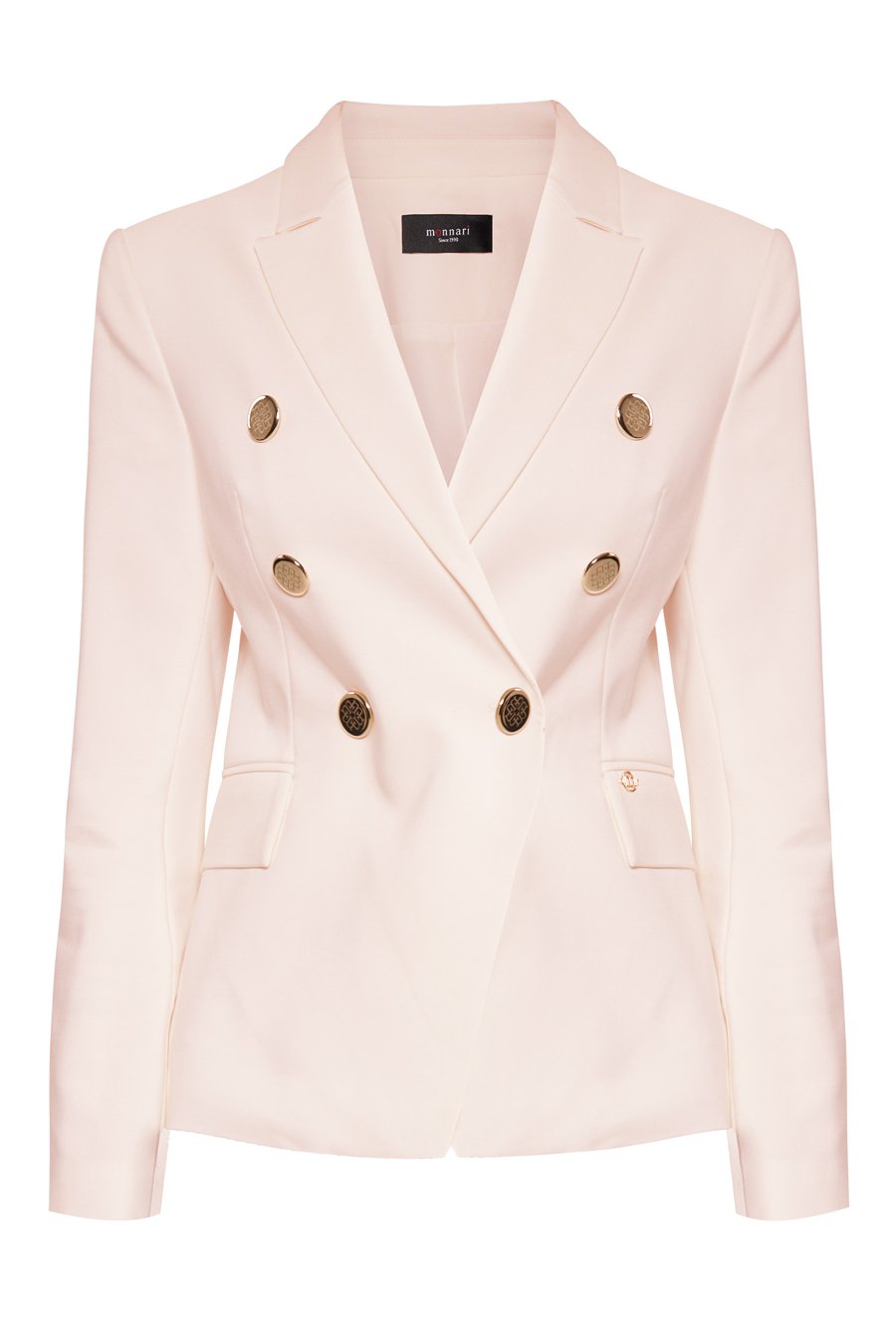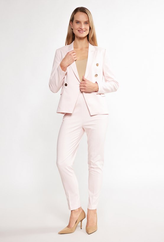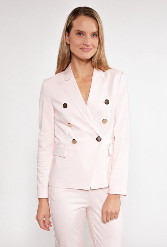 Elegancka marynarka damska z długimi rękawami, klasycznymi klapami oraz ozdobnymi patkami. Marynarka zapinana na guziki. Model ten z pewnością sprawdzi się w zestawie z białymi, eleganckimi spodniami. Modelka na zdjęciu ma 177 cm wzrostu i prezentuje rozmiar 36.