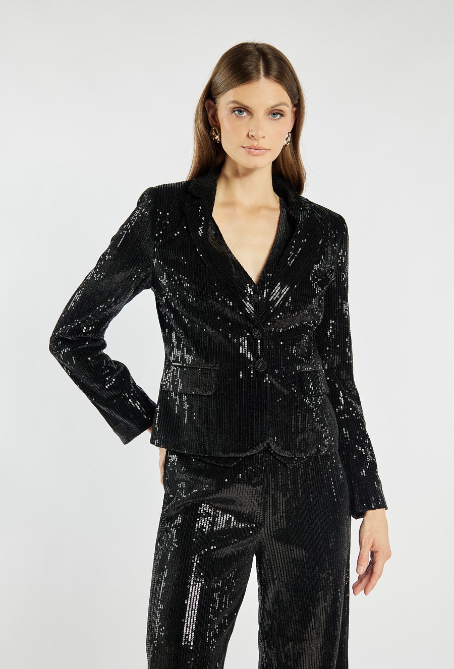 Elegancka marynarka o klasycznym kroju, wykonana z materiału ozdobionego subtelnym połyskiem. Zapinana na jeden guzik, z klapami i ozdobnymi patkami przy kieszeniach. Stylowa i efektowna – idealna na święta, sylwestra lub wyjątkowe wyjścia. Modelka na zdjęciu ma 177 cm wzrostu i prezentuje rozmiar 36.