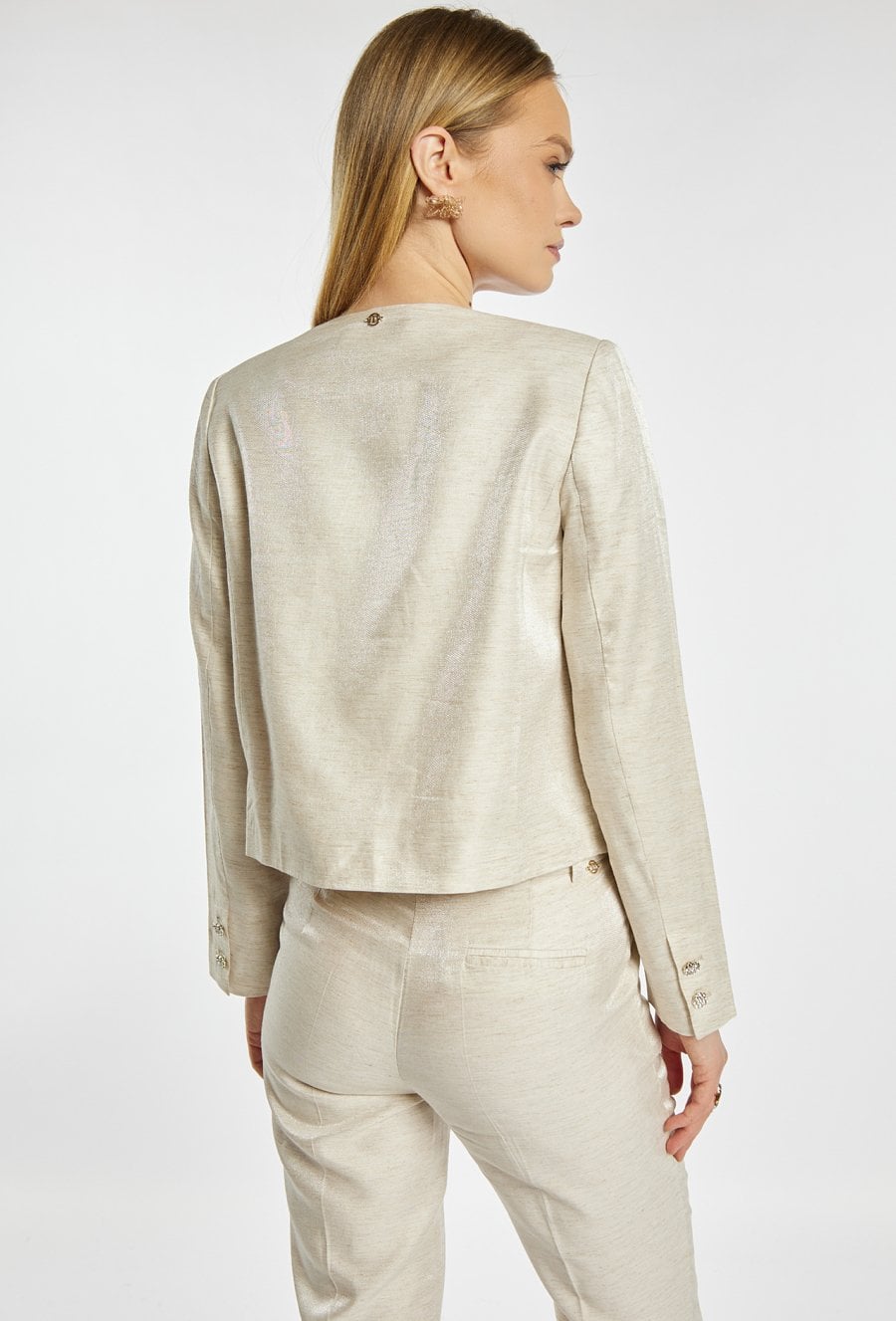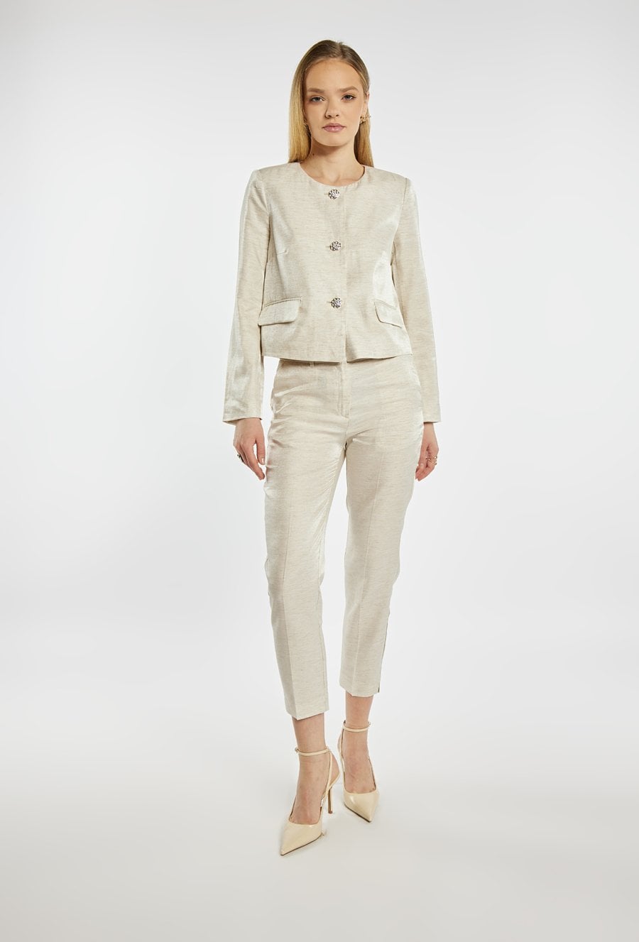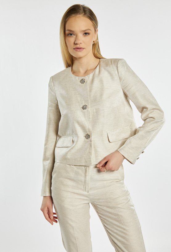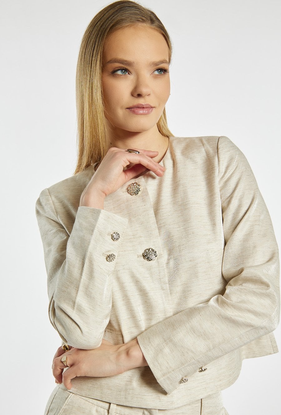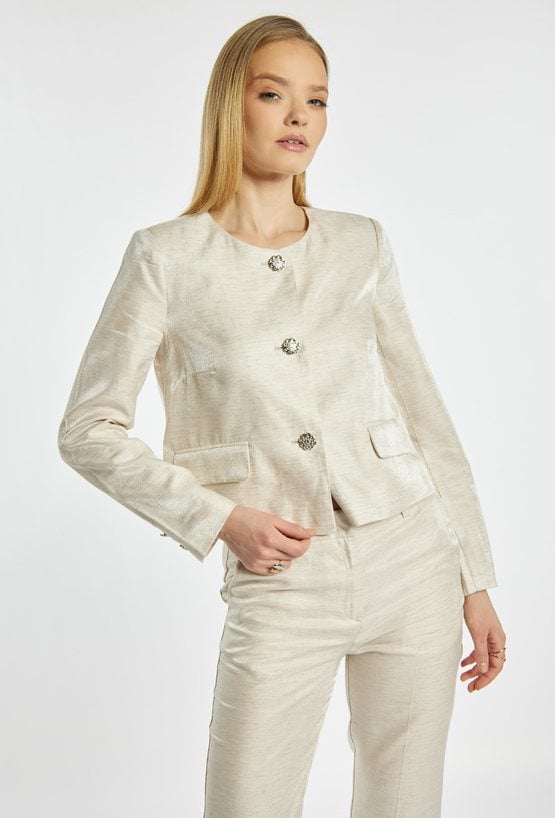 Żakiet damski o eleganckim, klasycznym kroju. Model z długim rękawem oraz półokrągłym dekoltem, zapinany na ozdobne guziki. Prosta forma i staranne wykończenie nadają całości szykownego i ponadczasowego charakteru. Model świetnie komponuje się z pasującymi spodniami z tej samej linii, tworząc modny i spójny komplet. Kod do spodni: 26L-TRU1000. Modelka na zdjęciu ma 177 cm wzrostu i prezentuje rozmiar 36.