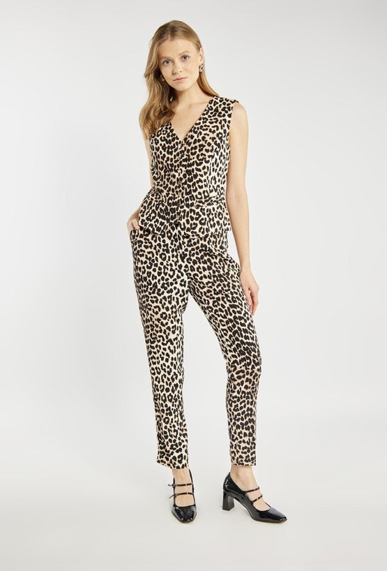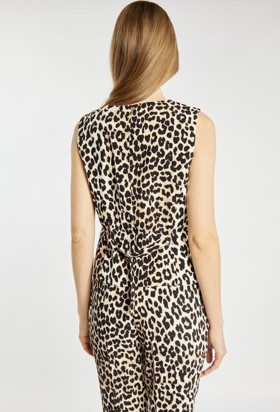 Kamizelka w modny wzór, zapinana z przodu na guziki, to połączenie elegancji i wyrazistego stylu. Dopasowany krój podkreśla sylwetkę, a głęboki dekolt w kształcie litery V dodaje kobiecego charakteru.
