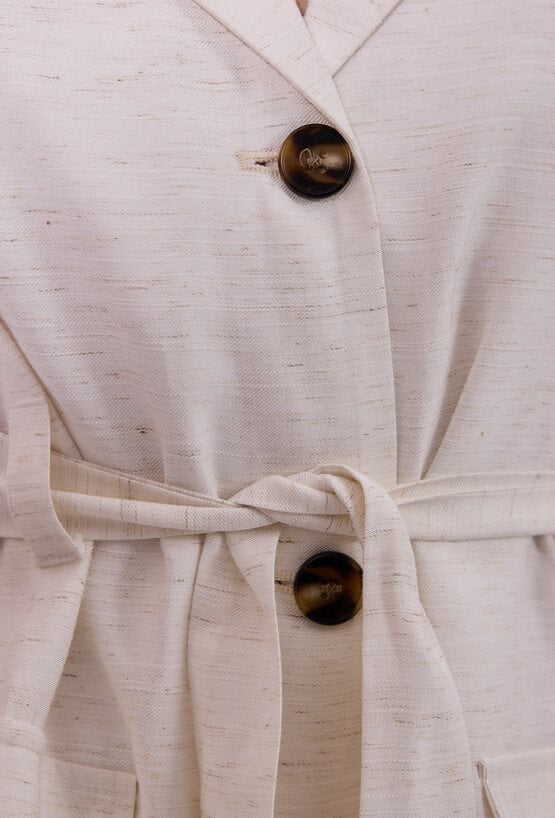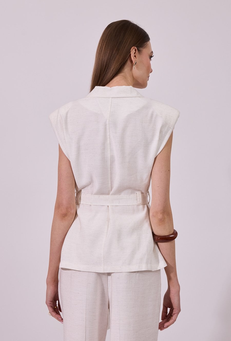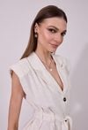 Kamizelka damska o eleganckim, dopasowanym kroju bez rękawów. Model z klasycznym kołnierzem i klapami, zapinany na guziki, który łączy w sobie styl marynarki i lekkość letniej formy. W talii zastosowano pasek do wiązania, pozwalający na podkreślenie sylwetki i indywidualne dopasowanie. Doskonale sprawdzi się zarówno w eleganckich, jak i bardziej casualowych stylizacjach. Modelka na zdjęciu ma 177 cm wzrostu i prezentuje rozmiar 36.