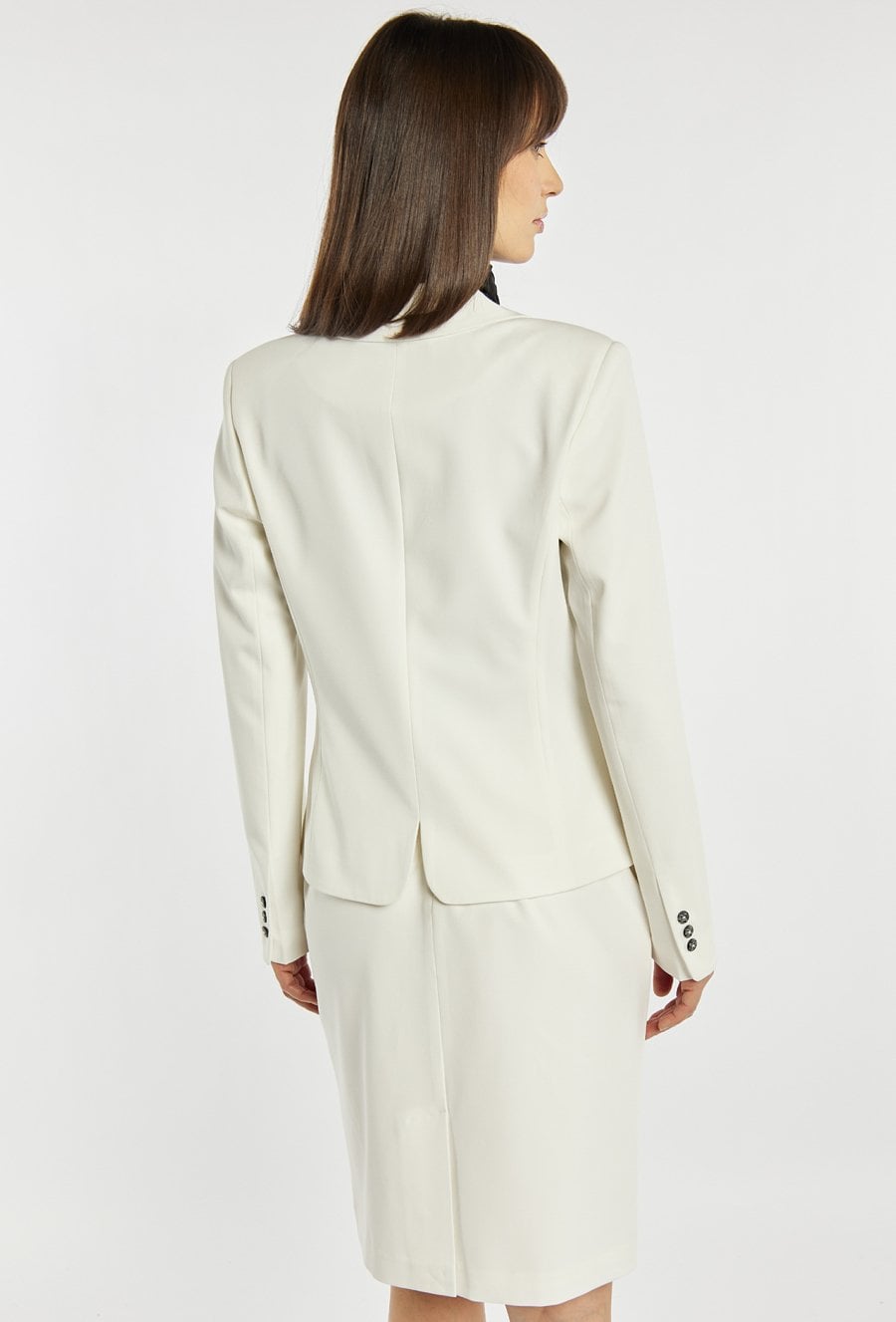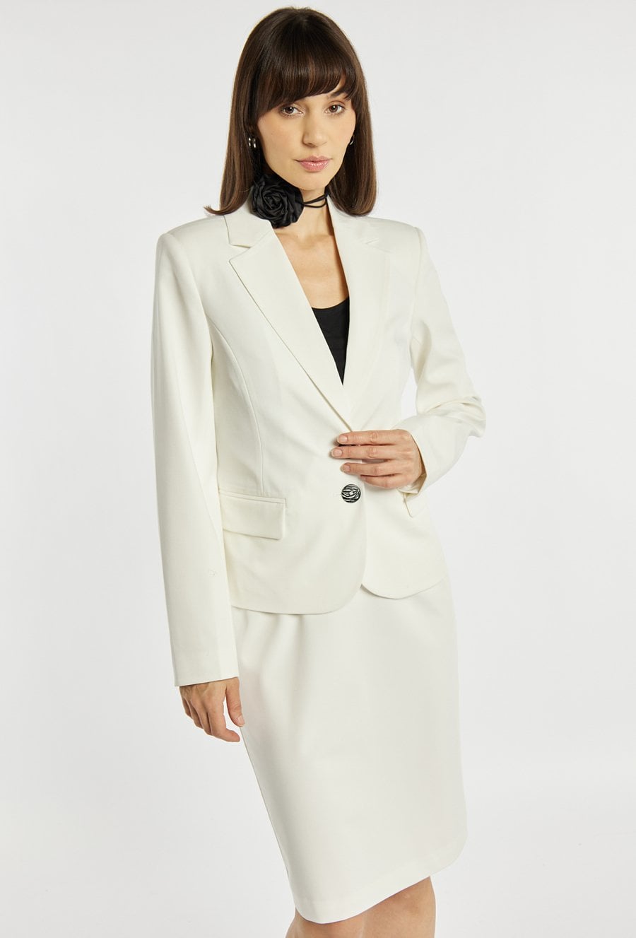 Marynarka damska wykonana z eleganckiego, gładkiego materiału. Marynarka o klasycznym kroju z kołnierzem, długim rękawem i zapięciem na dwa ozdobne guziki podkreśla sylwetkę i dodaje stylizacjom formalnego charakteru. Model polecamy zestawić ze spódniczką z tej samej linii. Kod do spódnicy: 26W-SKR0120. Modelka na zdjęciu ma 177 cm wzrostu i prezentuje rozmiar 36.