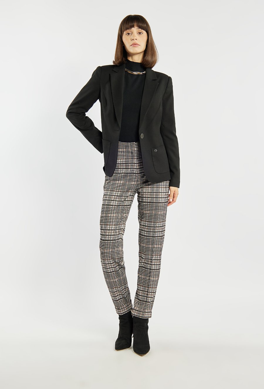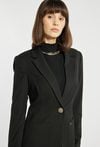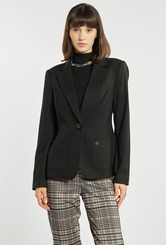 Marynarka o klasycznym kroju zapinana na jeden guzik, która łączy elegancję z ponadczasowym stylem. Wyróżnia się prostym fasonem z klapami oraz naszytymi kieszeniami z przodu. Subtelny detal w postaci ozdobnego guzika dodaje jej charakteru. Idealna do biura, jak i do codziennych stylizacji w stylu smart casual. Modelka na zdjęciu ma 177 cm wzrostu i prezentuje rozmiar 36.