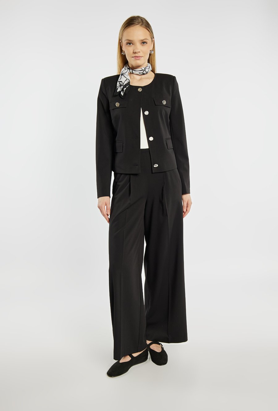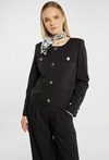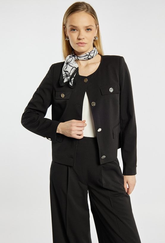 Żakiet o klasycznym, prostym kroju, zapinany na ozdobne guziki, z dekoracyjnymi patkami na przodzie. Gładka forma i eleganckie wykończenie sprawiają, że żakiet dobrze układa się na sylwetce i nadaje stylizacji uporządkowany charakter. Żakiet sprawdzi się zarówno w zestawach biurowych, jak i bardziej eleganckich, a dodatkowo można go zestawić z pasującymi spodniami. Kod do spodni: 26W-TRU0600.