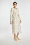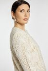 Elegancki żakiet damski o krótszym kroju z długim rękawem. Model wykonany z efektownej koronki, zapinany na guziki, który nadaje stylizacji wyjątkowego i kobiecego charakteru. Żakiet doskonale sprawdzi się na komunię, przyjęcia, spotkania oraz inne uroczystości. Modelka na zdjęciu ma 177 cm wzrostu i prezentuje rozmiar 36.