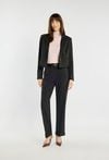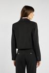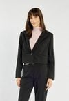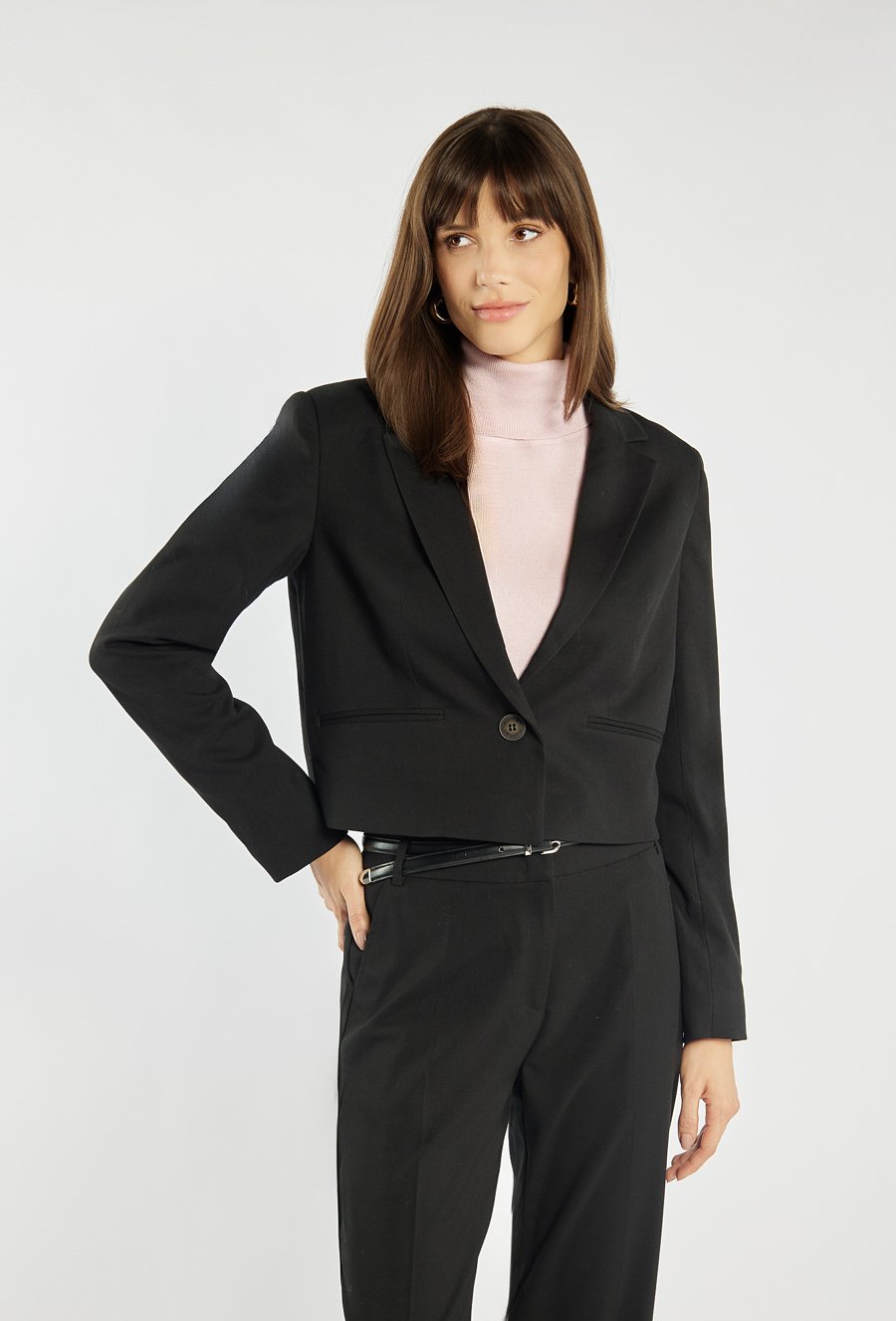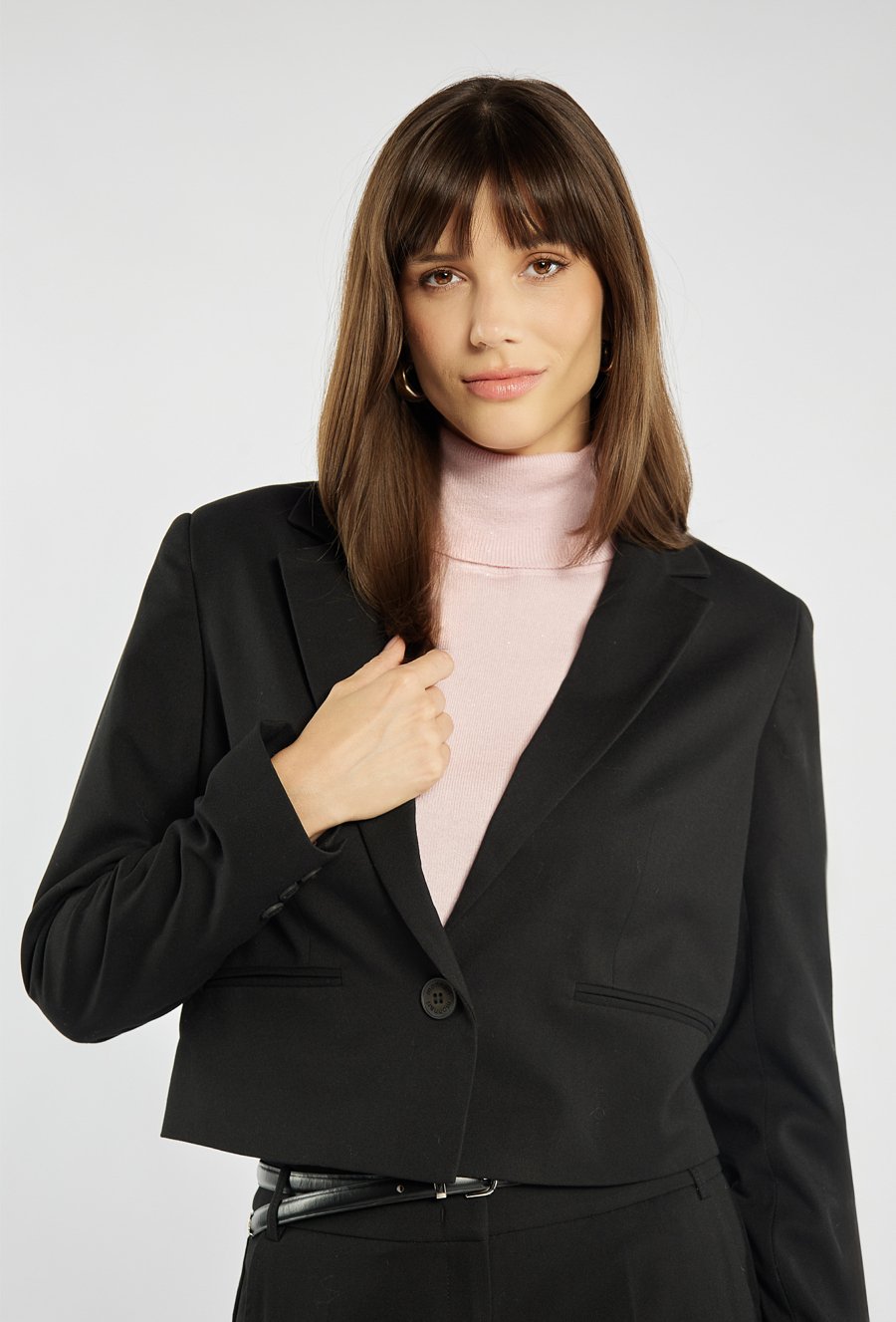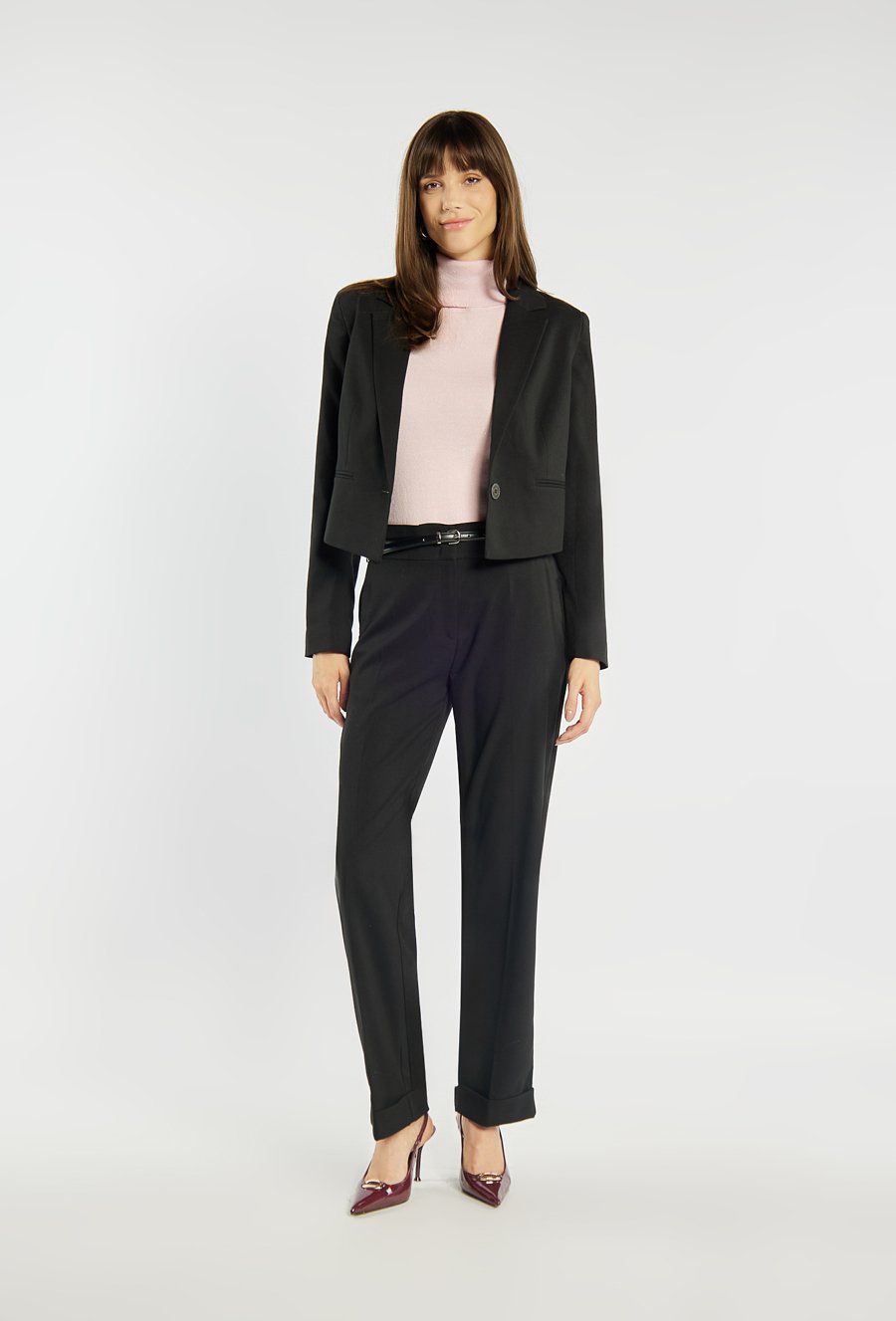 Marynarka damska o krótkim, taliowanym kroju, zapinana na jeden guzik. Klasyczne klapy oraz dopasowana linia podkreślają elegancki charakter modelu. Z przodu znajdują się dwie kieszenie w formie ciętych listewek. Dzięki swojej długości marynarka doskonale akcentuje talię i sprawdza się w zestawach zarówno biurowych, jak i wieczorowych. Modelka na zdjęciu ma 177 cm wzrostu i prezentuje rozmiar 36.