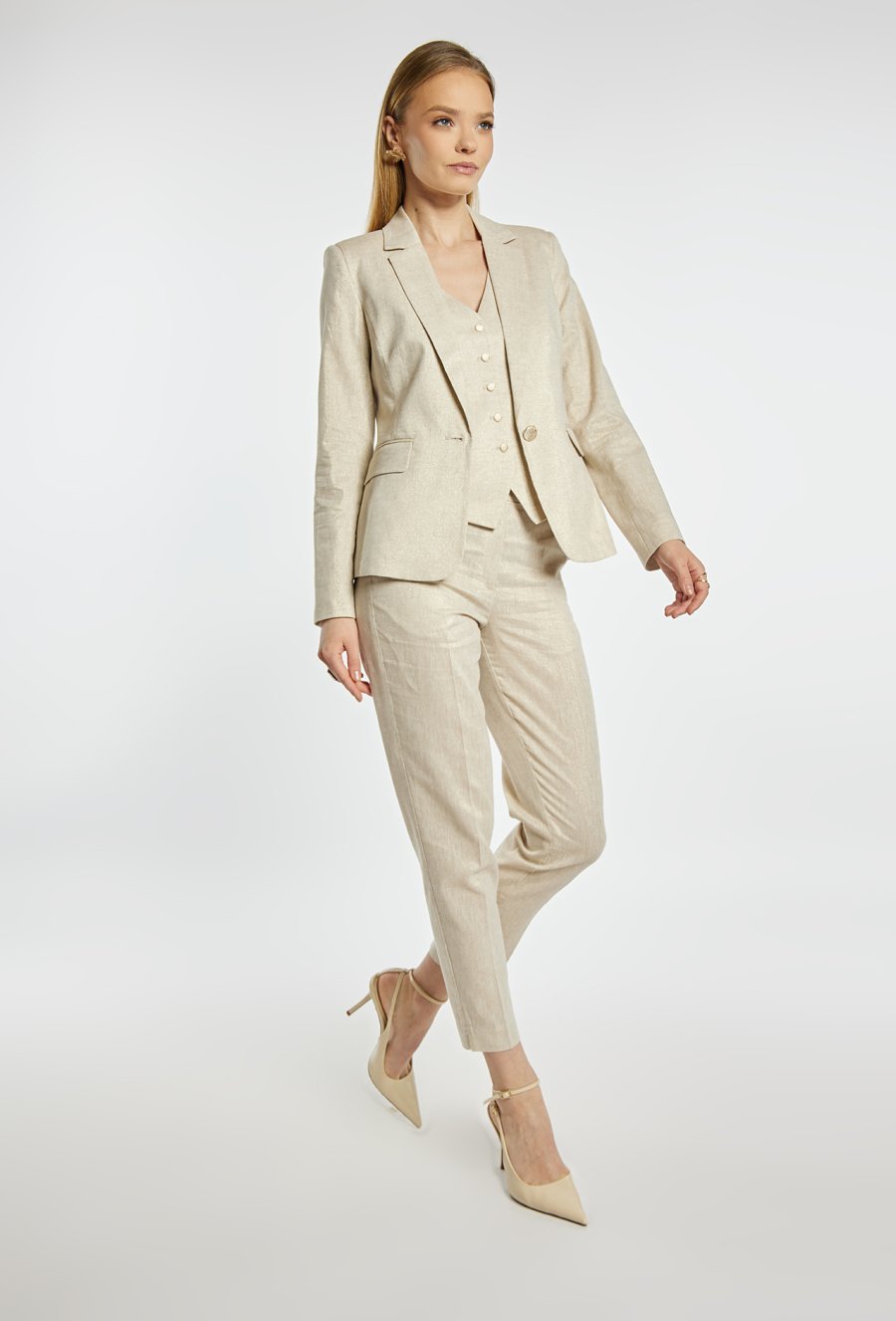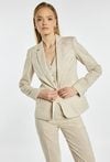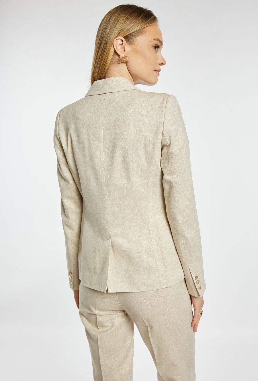 Elegancka marynarka damska o klasycznym kroju z długim rękawem. Model z kołnierzem i klapami, który nadaje stylizacji ponadczasowego charakteru. Marynarkę można zestawić z pasującymi spodniami, tworząc stylowy i elegancki komplet. Kod do spodni: 26L-TRU1130. Modelka na zdjęciu ma 177 cm wzrostu i prezentuje rozmiar 36.