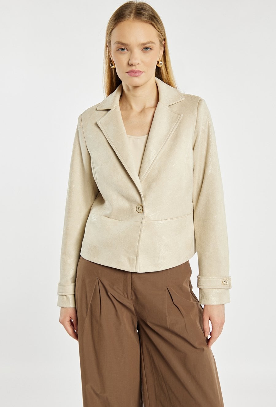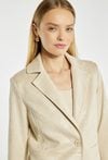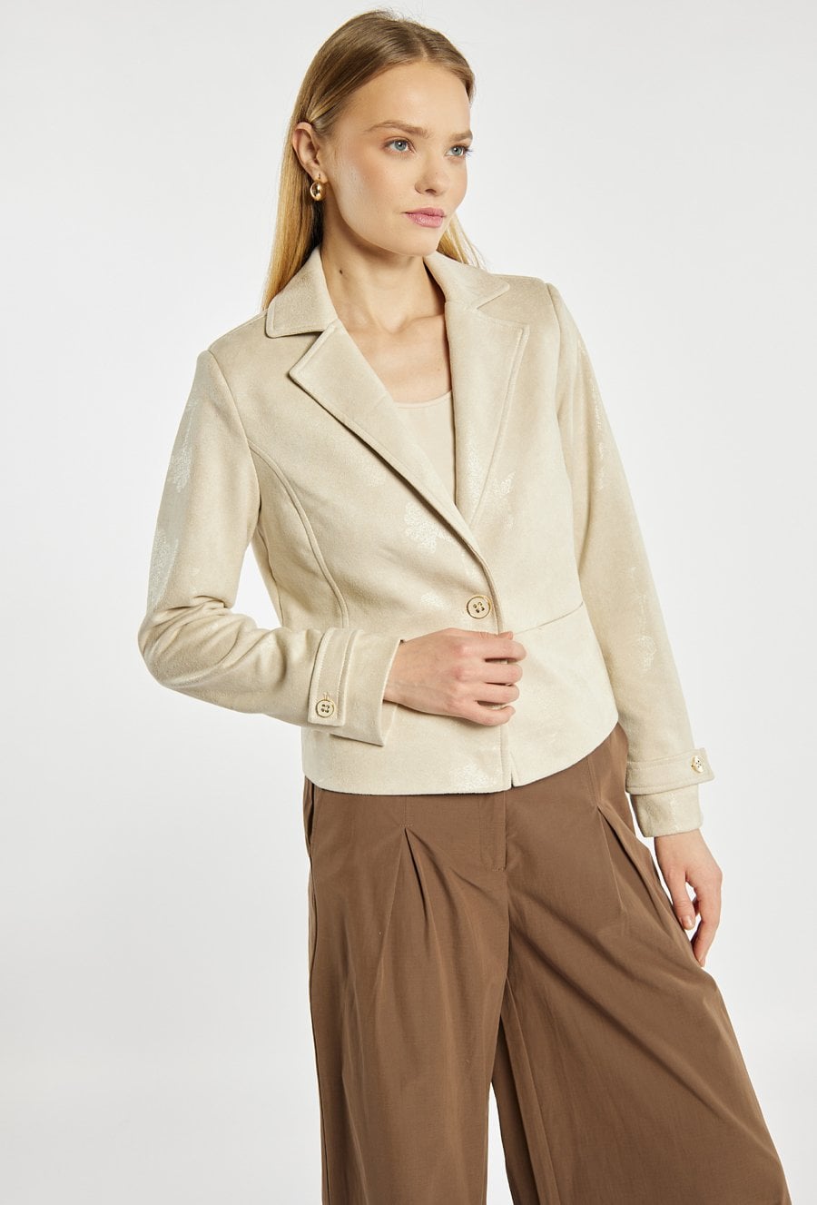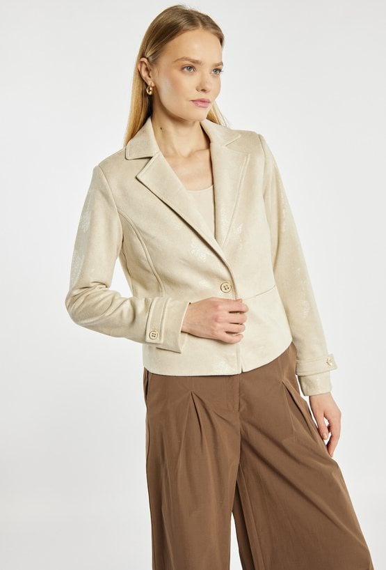 Marynarka damska o eleganckim, klasycznym fasonie. Model z klapami, zapinany na guzik, z długimi rękawami wykończonymi ozdobnym mankietem. Idealna do eleganckich stylizacji. Modelka na zdjęciu ma 177 cm wzrostu i prezentuje rozmiar 36.