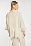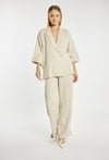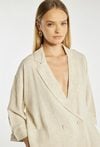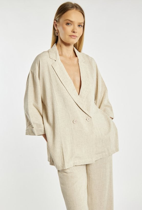 Marynarka damska o luźnym, oversize’owym kroju. Model o kopertowym fasonie, zapinany na guziki, z klasycznym kołnierzem i klapami, które nadają całości eleganckiego, a zarazem swobodnego charakteru. Idealnie sprawdzi się w stylizacjach casualowych i smart casual. Modelka na zdjęciu ma 177 cm wzrostu i prezentuje rozmiar 36. Marynarkę możemy zestawić z pasującymi spodniami. Kod do spodni: 26L-TRU1541-K015.