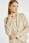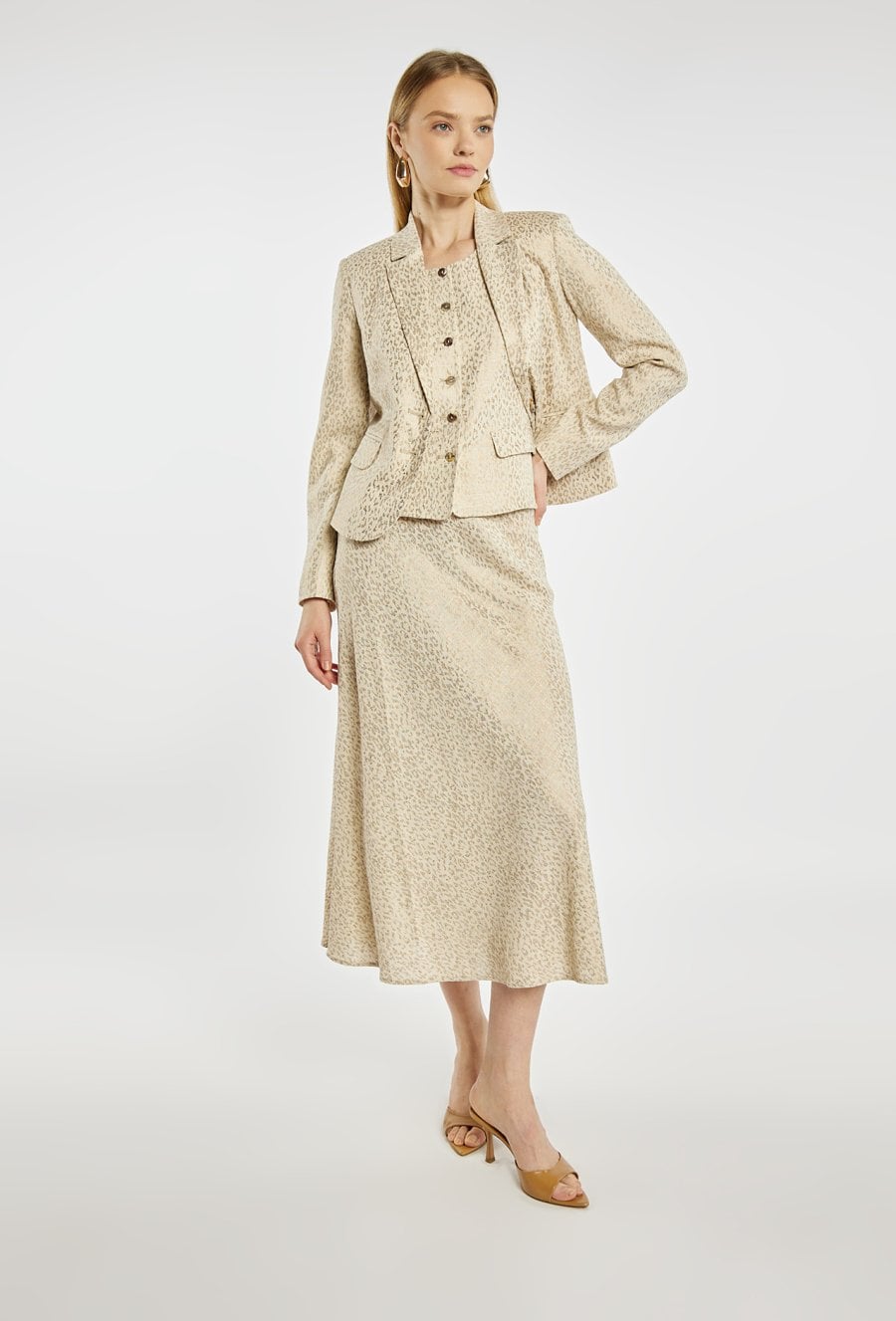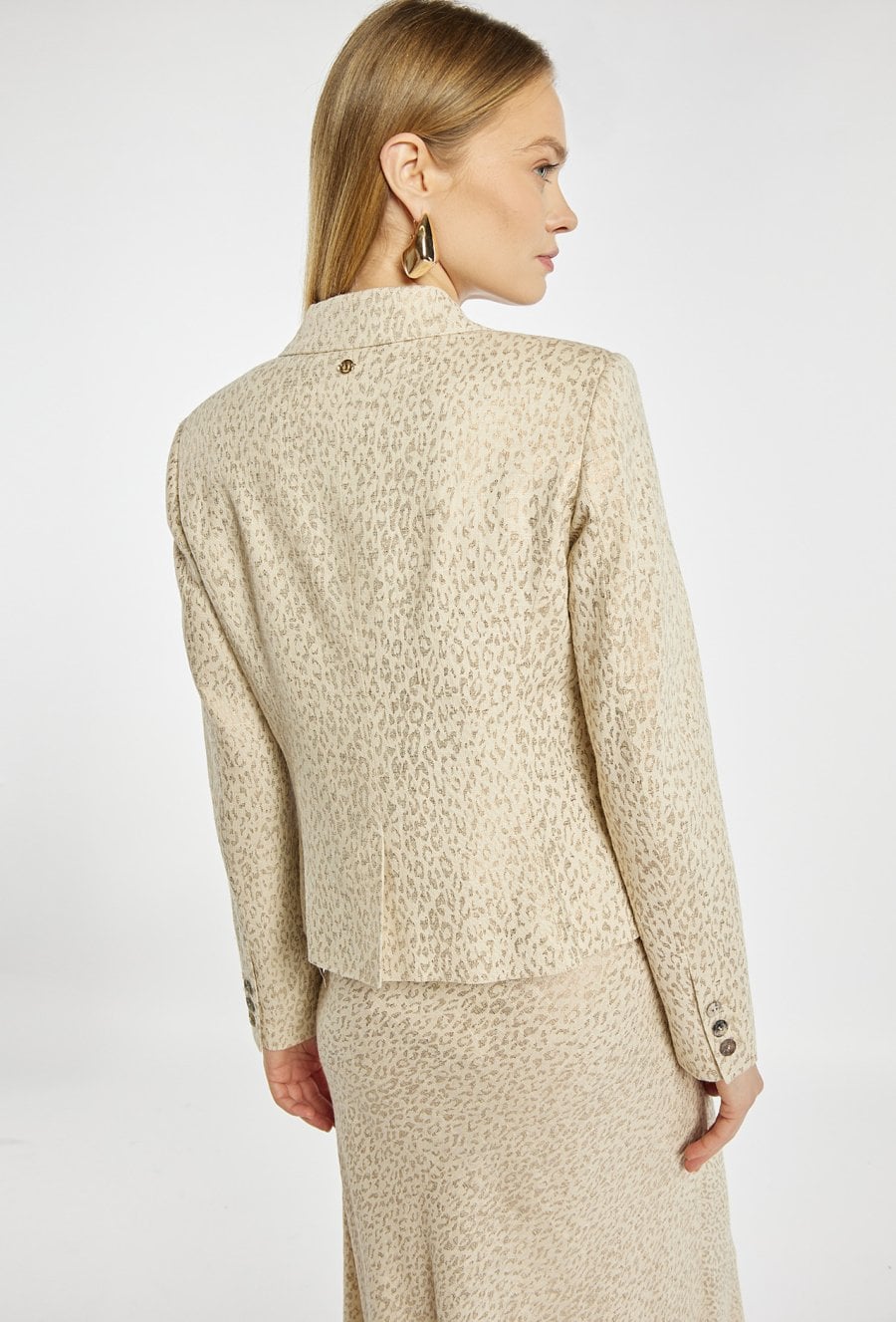 Marynarka damska o klasycznym, lekko taliowanym fasonie, wykonana z eleganckiego materiału w subtelny zwierzęcy wzór w jasnej, neutralnej kolorystyce. Model zapinany na guziki, z klasycznymi klapami i długimi rękawami. Marynarkę można zestawić z pasującą spódnicą, tworząc spójny i stylowy komplet, idealny zarówno na co dzień, jak i na bardziej eleganckie okazje. Kod do spódnicy: 26W-SKR0270. Modelka na zdjęciu ma 177 cm wzrostu i prezentuje rozmiar 36.