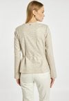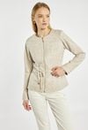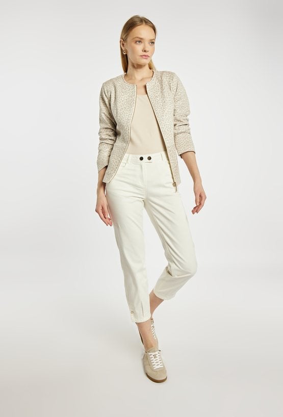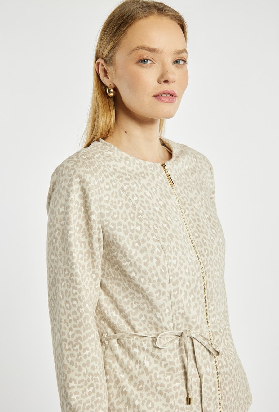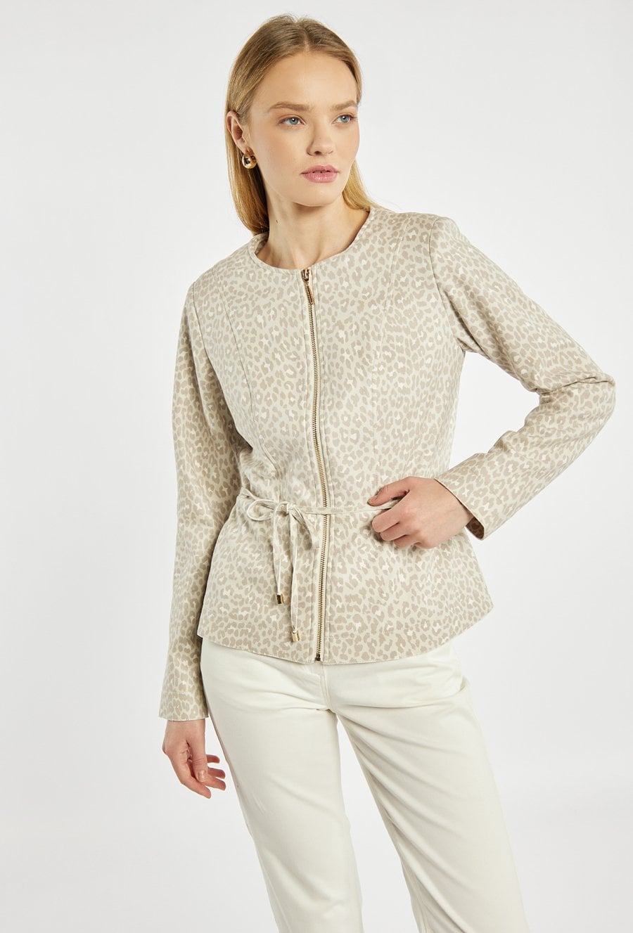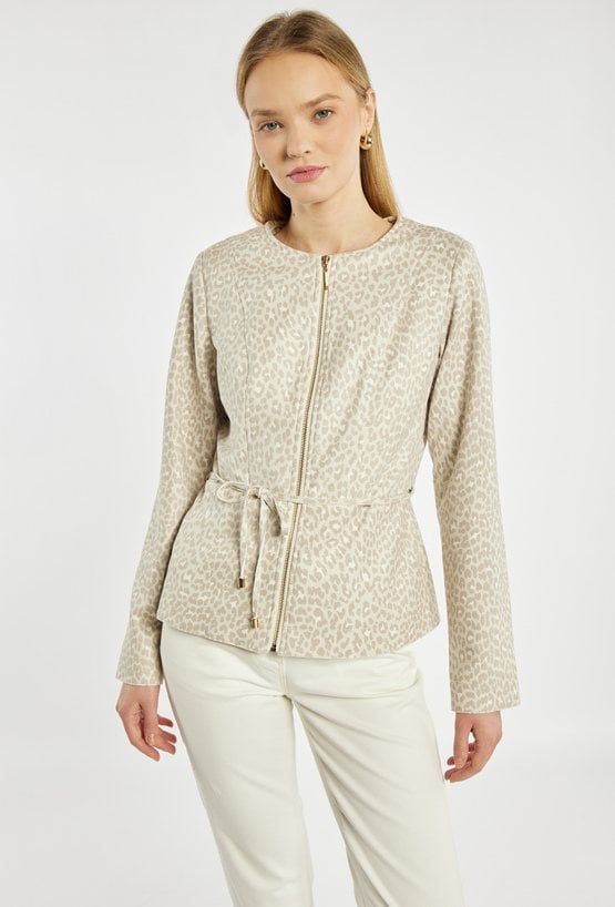 Marynarka damska o eleganckim, lekko dopasowanym fasonie. Model zapinany na zamek, z okrągłym dekoltem oraz długimi rękawami. Wiązanie w talii pozwala podkreślić sylwetkę i dopasować fason do figury. Marynarka w jasnym kolorze z subtelnym zwierzęcym wzorem. Modelka na zdjęciu ma 177 cm wzrostu i prezentuje rozmiar 36.