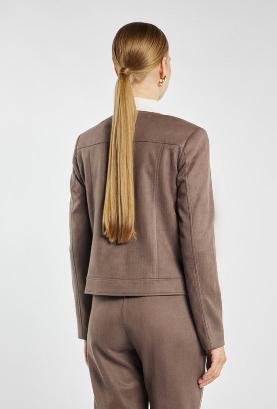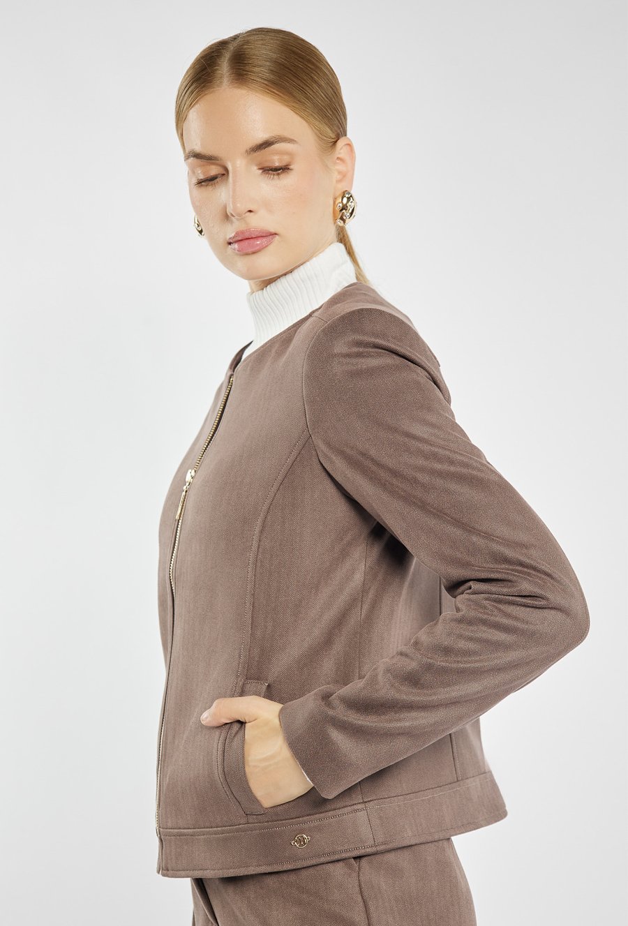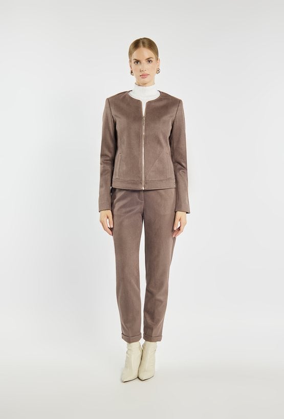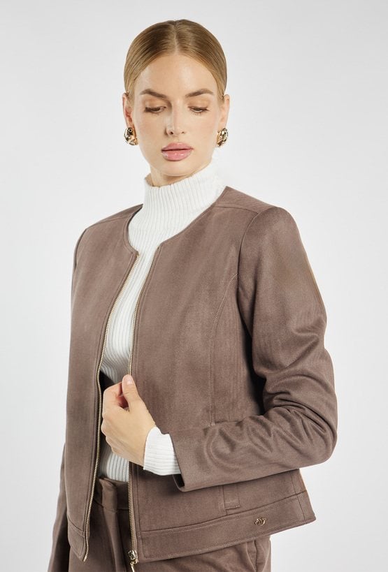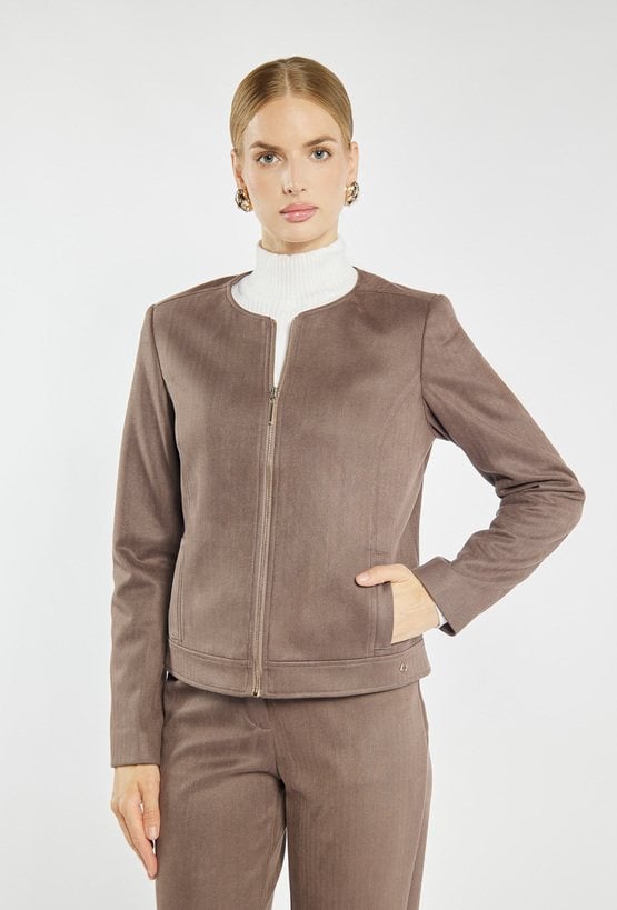 Żakiet damski zapinany na zamek, o prostym kroju z okrągłym dekoltem. Żakiet prezentuje elegancki i nowoczesny styl. Model można skompletować ze spodniami z tej samej kolekcji, tworząc spójny i efektowny zestaw. Kod do spodni: 25Z-TRU3090. Modelka na zdjęciu ma 177 cm wzrostu i prezentuje rozmiar 36.