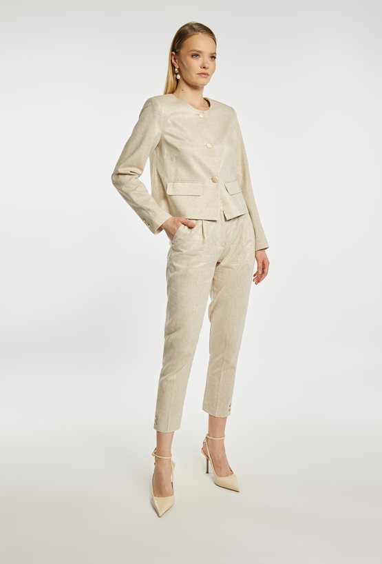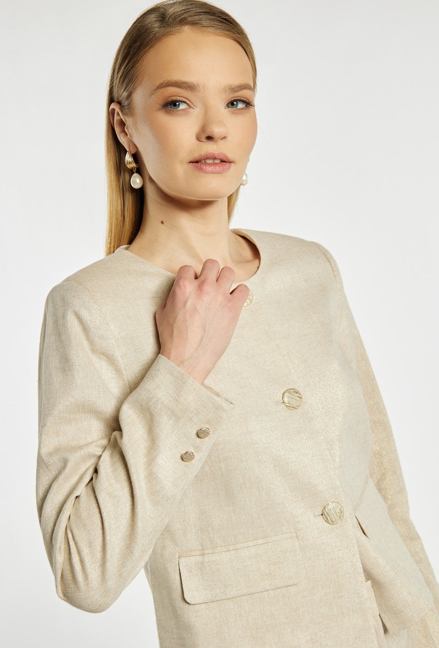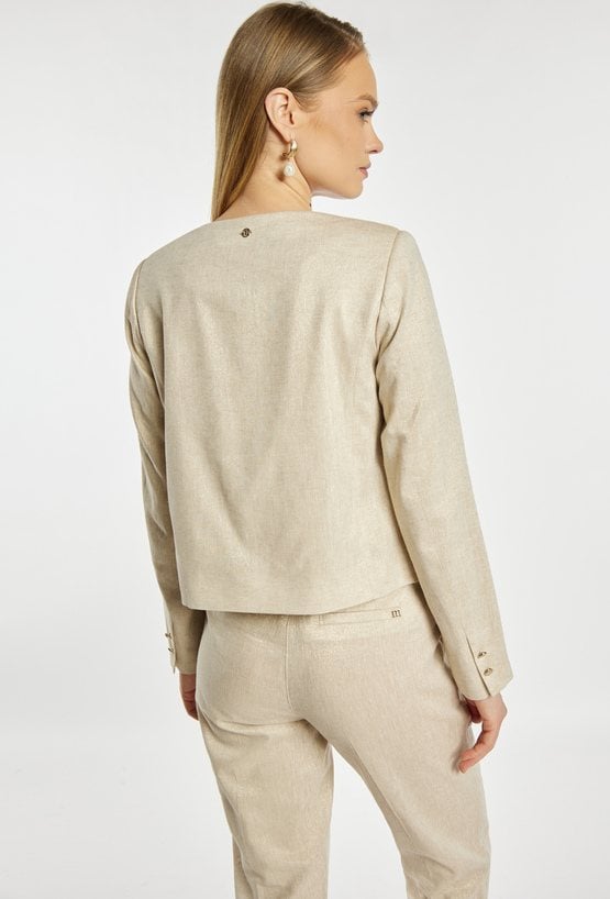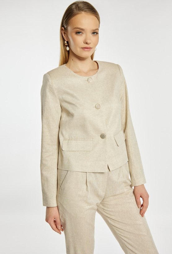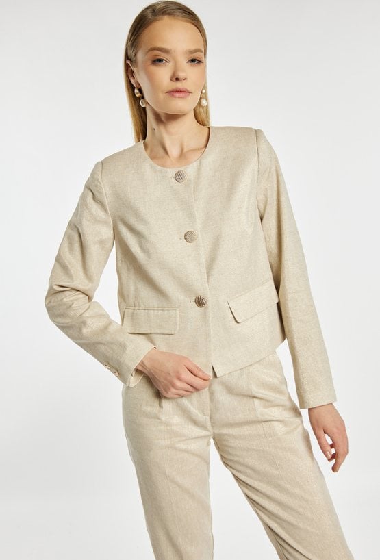 Elegancki żakiet damski o klasycznym kroju z długim rękawem, wykonany z materiału z dodatkiem lnu. Model zapinany na guziki z ozdobnymi klapkami kieszeni, który nadaje stylizacji eleganckiego charakteru. Żakiet doskonale sprawdzi się w stylizacjach wizytowych, do pracy oraz na różne uroczystości. Modelka na zdjęciu ma 177 cm wzrostu i prezentuje rozmiar 36.