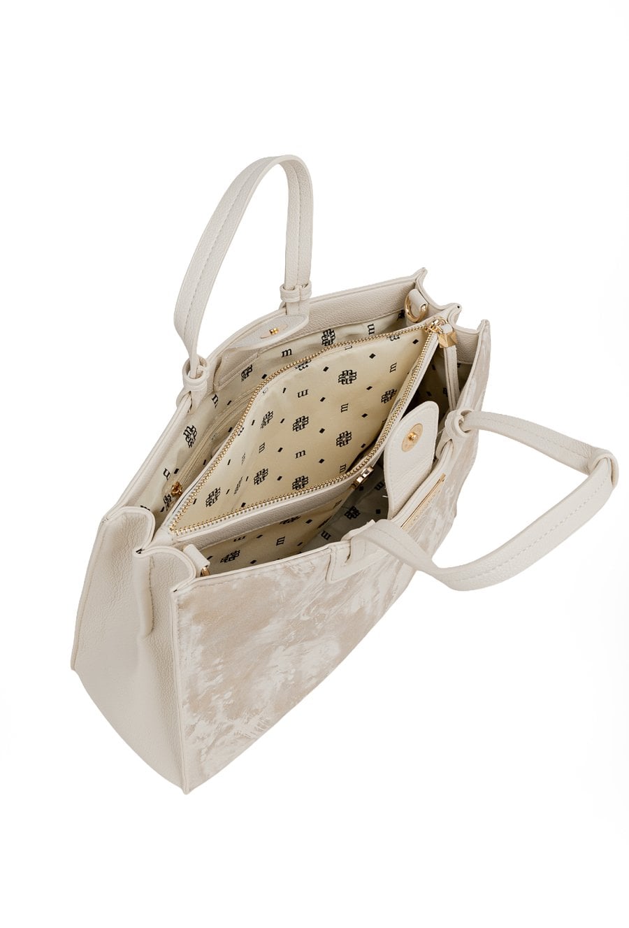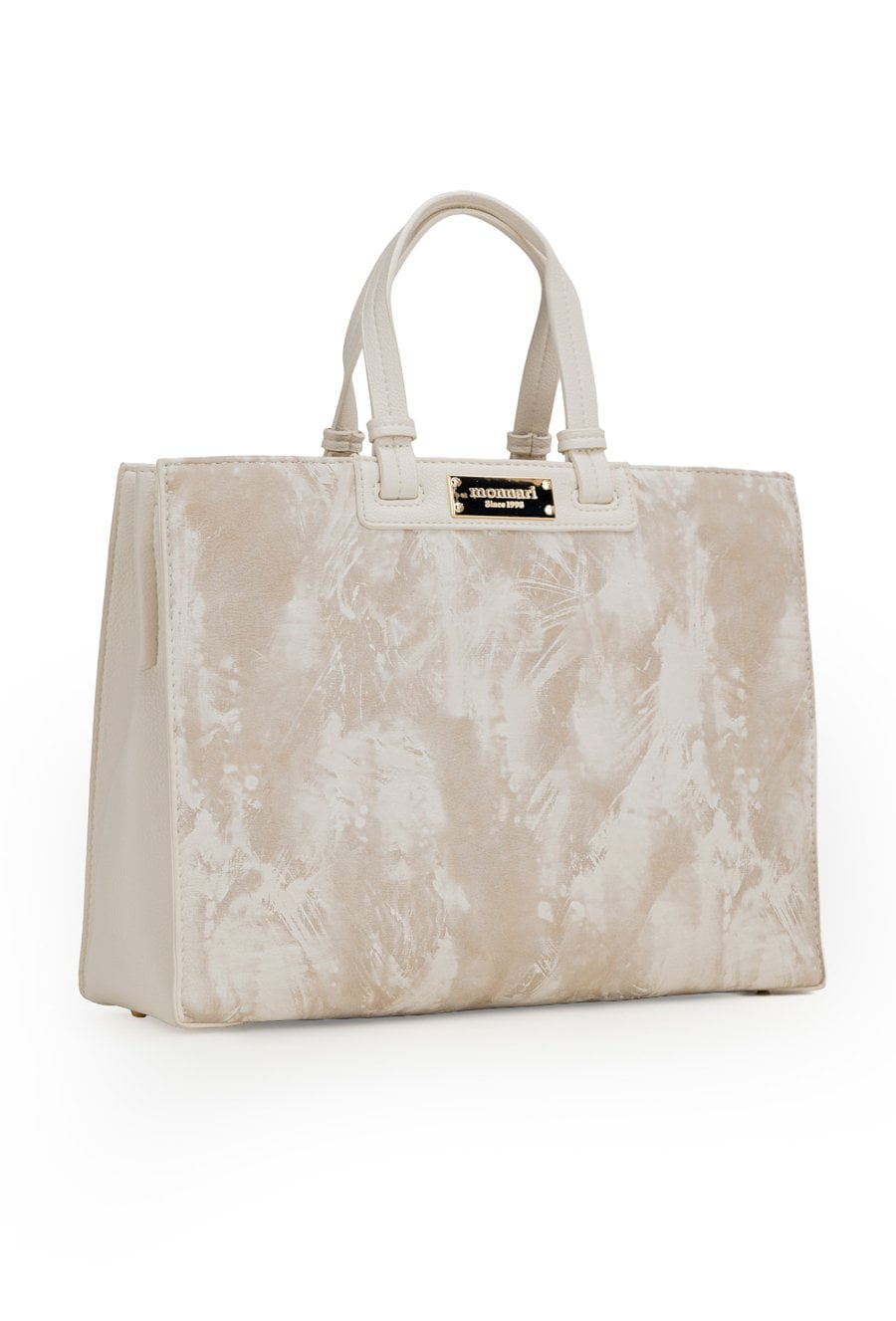 Torba damska z delikatnym wzorem z przodu to elegancki i praktyczny model na co dzień. Torba jest trzykomorowa – dwie duże, pojemne komory zapinane na napy oraz środkowa komora zapinana na suwak, co ułatwia organizację i bezpieczne przechowywanie rzeczy. Torba zawieszona na rączkach, w zestawie ma odpinany, regulowany pasek. Torbę należy przechowywać w dołączonym woreczku. Wymiary: 32,5 cm x 25 cm x 9 cm.